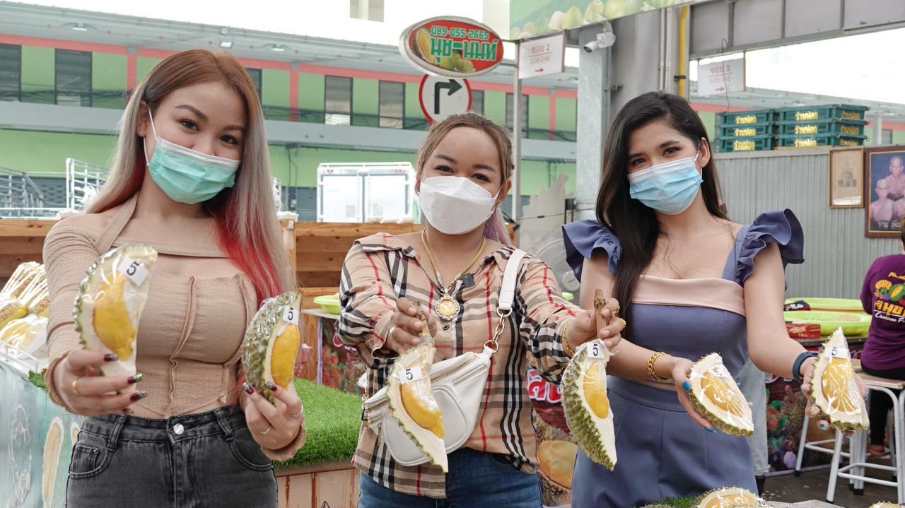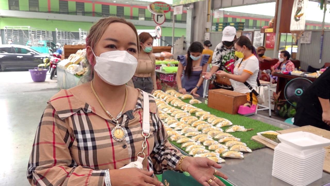 แม่ค้าร้านทุเรียน ในตลาดสี่มุมเมือง จัดโปรโมชันให้คนมีรายได้น้อย ฉลองสงกรานต์ ขายเริ่มต้นพูละ 5 บาท ตั้งแต่ 12-15 เมษายน 65
