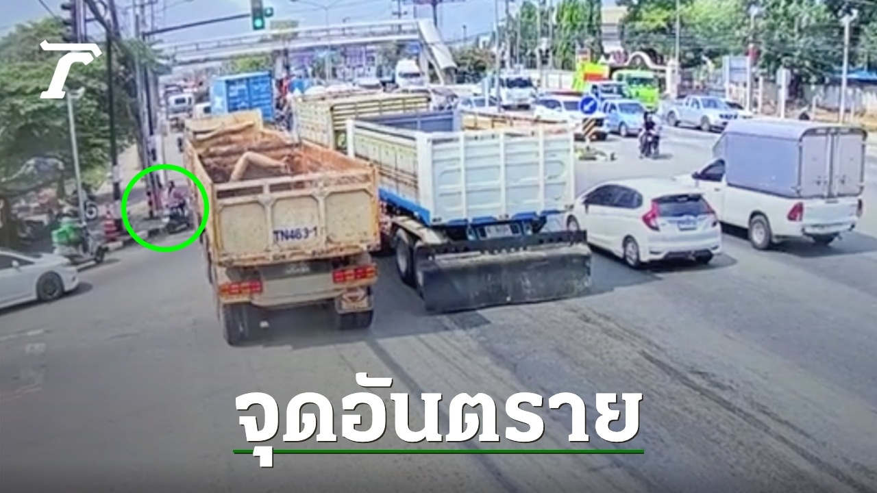 หญิงสาววัย 20 ปี ขี่จยย.เลี้ยวซ้าย ถูกรถบรรทุกพ่วง 18 ล้อ วิ่งผ่านแยกหลังได้สัญญาณไฟเขียว มาทางตรงช่องซ้ายสุด เฉี่ยวจยย.ล้มรถมุดเข้าไปใต้ท้อง ส่วนคนขี่ถูกทับร่างหลุดไปเสียชีวิตอยู่บนถนน
