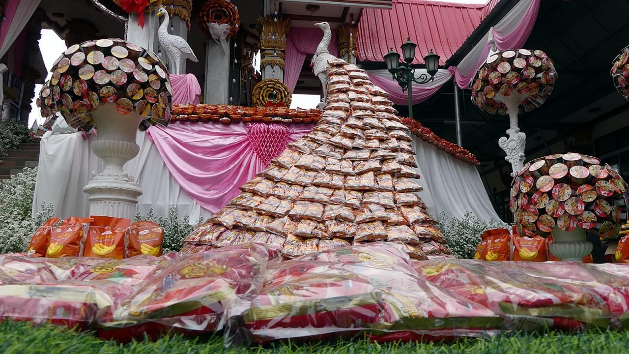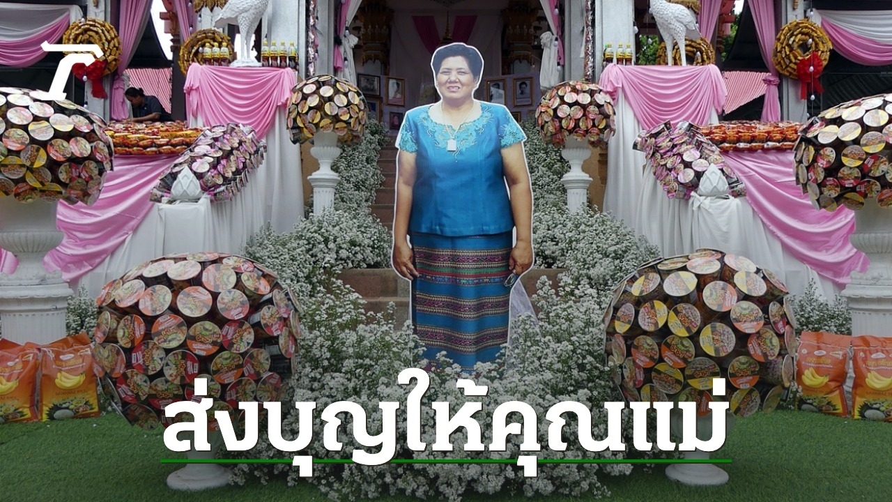จนปีนี้สถานการณ์เริ่มดีขึ้น จึงได้ปรึกษาญาติพี่น้องจัดทำบุญใหญ่ให้คุณแม่ศรี และบรรพบุรุษ แต่หากตกแต่งเมรุด้วยดอกไม้สด เมื่อเสร็จงานแล้วก็ต้องทิ้งไปไม่ได้ใช้ประโยชน์อะไร จึงตัดสินใจกันว่า จะใช้บะหมี่กึ่งสำเร็จรูป ข้าวสาร และอาหารแห้งมาตกแต่งเมรุ โดยพิธีทำบุญอัฐิคุณแม่ศรี และบรรพบุรุษ จะจัดขึ้นในวันที่ 4-5 พ.ค. เมื่อเสร็จงานทำบุญแล้ว ก็จะแจกจ่ายให้ชาวบ้านที่ขาดแคลน และได้รับผลกระทบจากสถานการณ์โควิด จะทำให้คุณแม่ศรี และบรรพบุรุษ ได้รับผลบุญกุศลด้วย ซึ่งในการนำข้าวสารอาหารแห้งมาตกแต่งเมรุในครั้งนี้ ใช้เงินประมาณ 1 แสนบาท ส่วนช่างที่มาจัดตกแต่งมาจากร้านของตัวเอง.