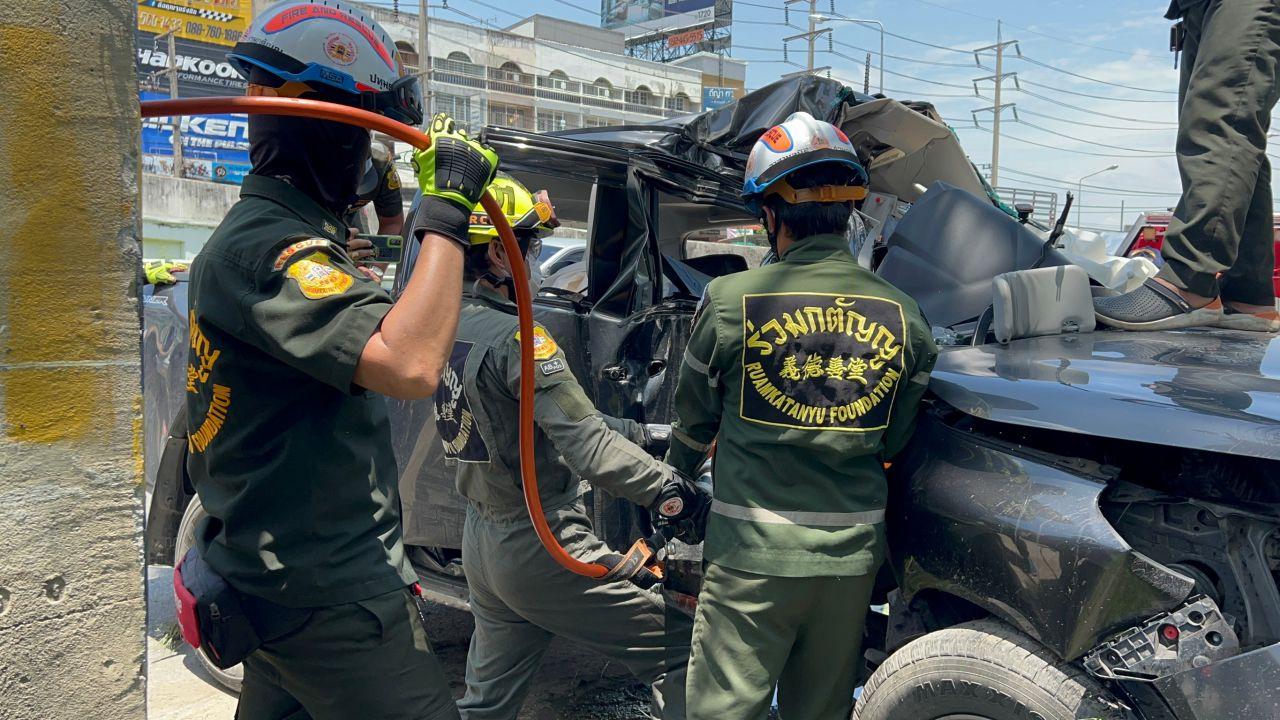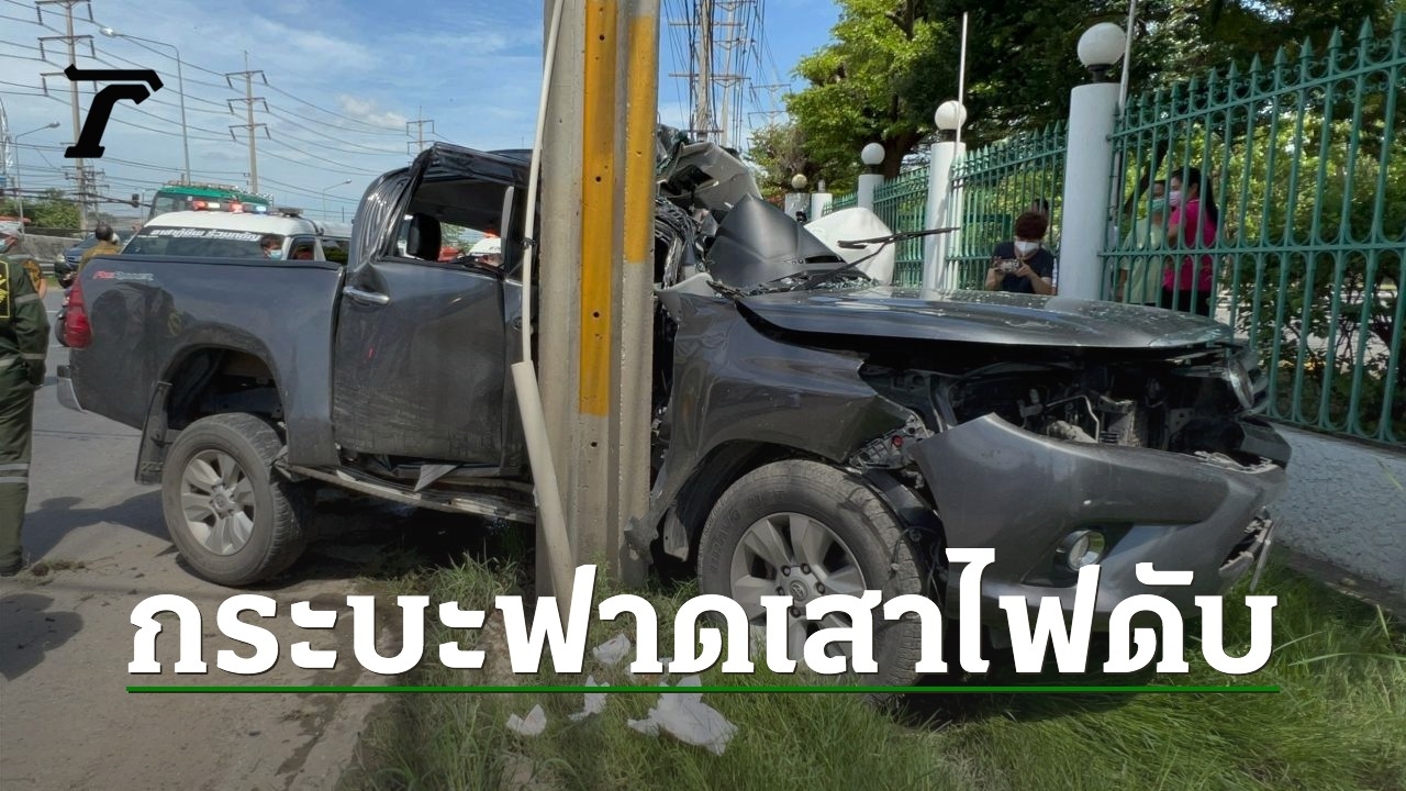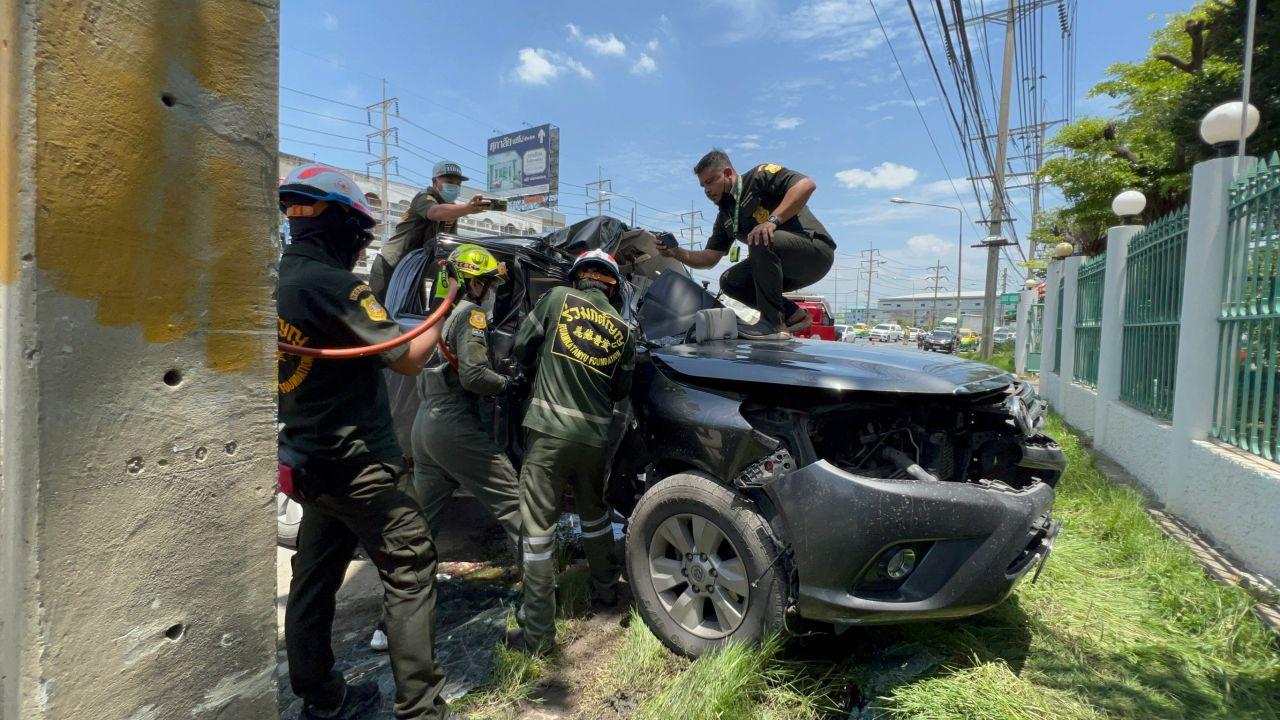 นักเรียนหนุ่มไต้หวันวัยเพียง 17 ปี ขับกระบะรีบไปสอบที่โรงเรียน แต่รถเสียหลักทางโค้ง หมุนฟาดใส่เสาไฟฟ้าหน้าสนามซ้อมกอล์ฟบางพูน เสียชีวิตคาซากรถ กู้ภัยต้องนำเครื่องมือตัดถ่างงัดร่างออกมา