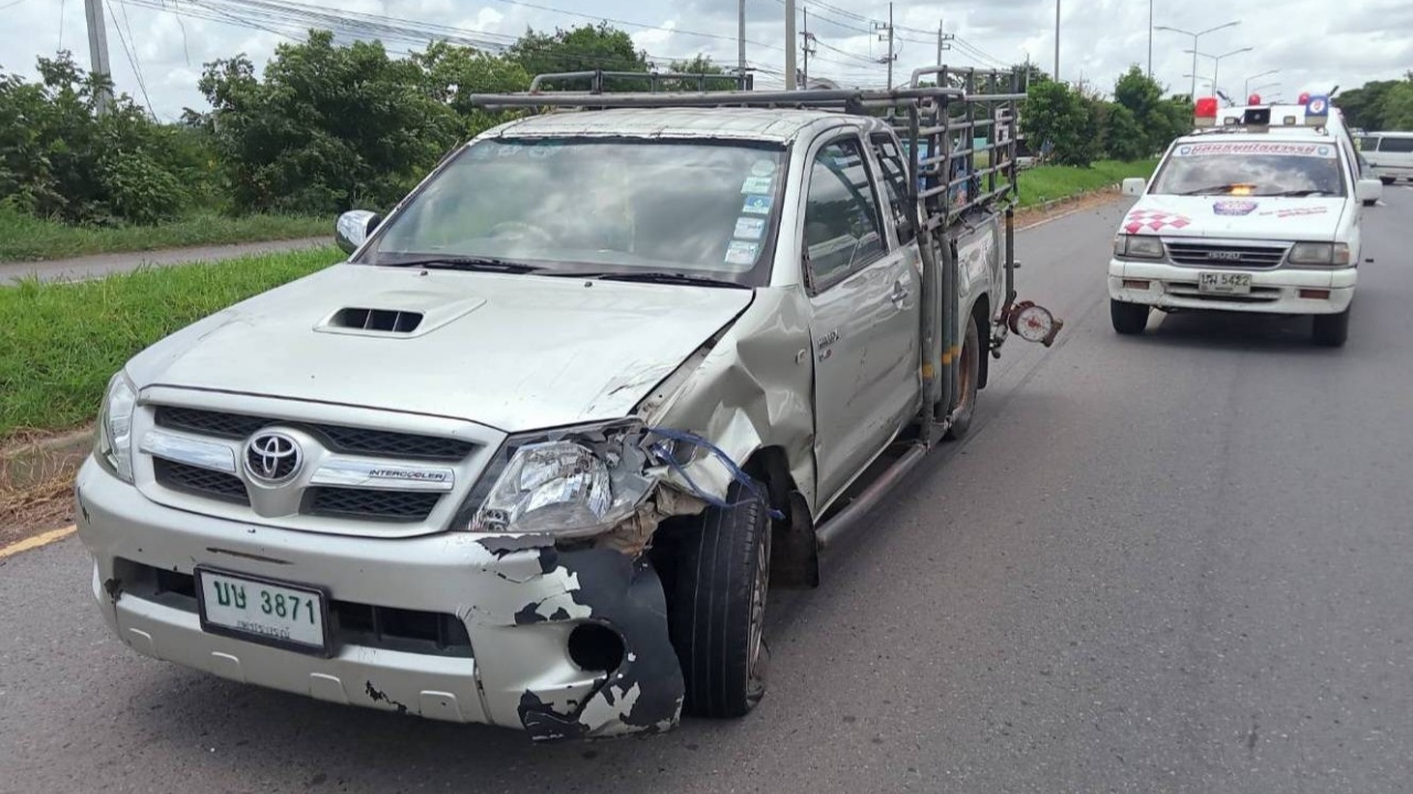 นาทีตาย หนุ่มซิ่งกระบะเร่งเครื่องหวังแซงสิบล้อแต่ไม่พ้น หักหลบซ้ายชนท้ายจักรยานยนต์พ่วงข้าง คนขี่ขาขาดกระเด็นกระแทกถนนดับคาที่
