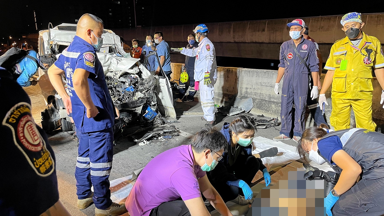 กู้ภัยเก็บศพนายอัครชัย ห่วงแก้ว คนขับ และนายบัญชา เอี่ยมพรม นั่งมาในรถตู้มินิแวนโตโยต้า VOXY พุ่งชนท้ายรถบรรทุก 10 ล้อ บนสะพานพระนั่งเกล้าใหม่ ขาออก อ.เมืองนนทบุรี เสียชีวิต 2 ศพ และมีผู้ได้รับบาดเจ็บ 1 คน.