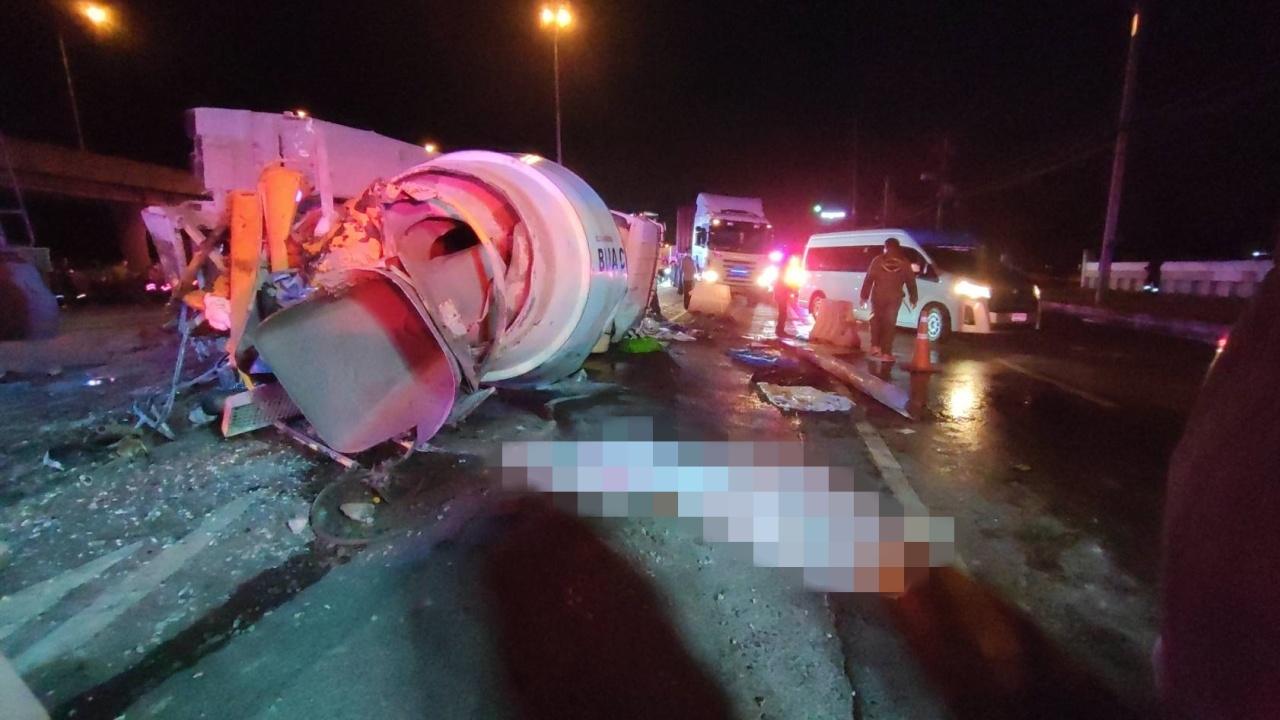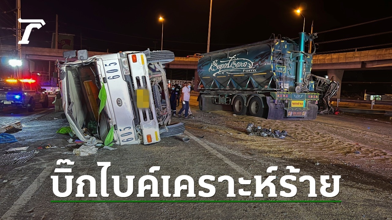 บิ๊กไบค์โซ่ขาดคาถนน รถสิบล้อโม่ปูนเห็นจอดช่วย สนั่น ถูกรถพ่วงบรรทุกอาหารสัตว์ชนเต็มๆ พลิกคว่ำพังยับ ทับไบเกอร์วัย 25 ดับสนิทคาที่ บาดเจ็บ 3 หามส่ง รพ.