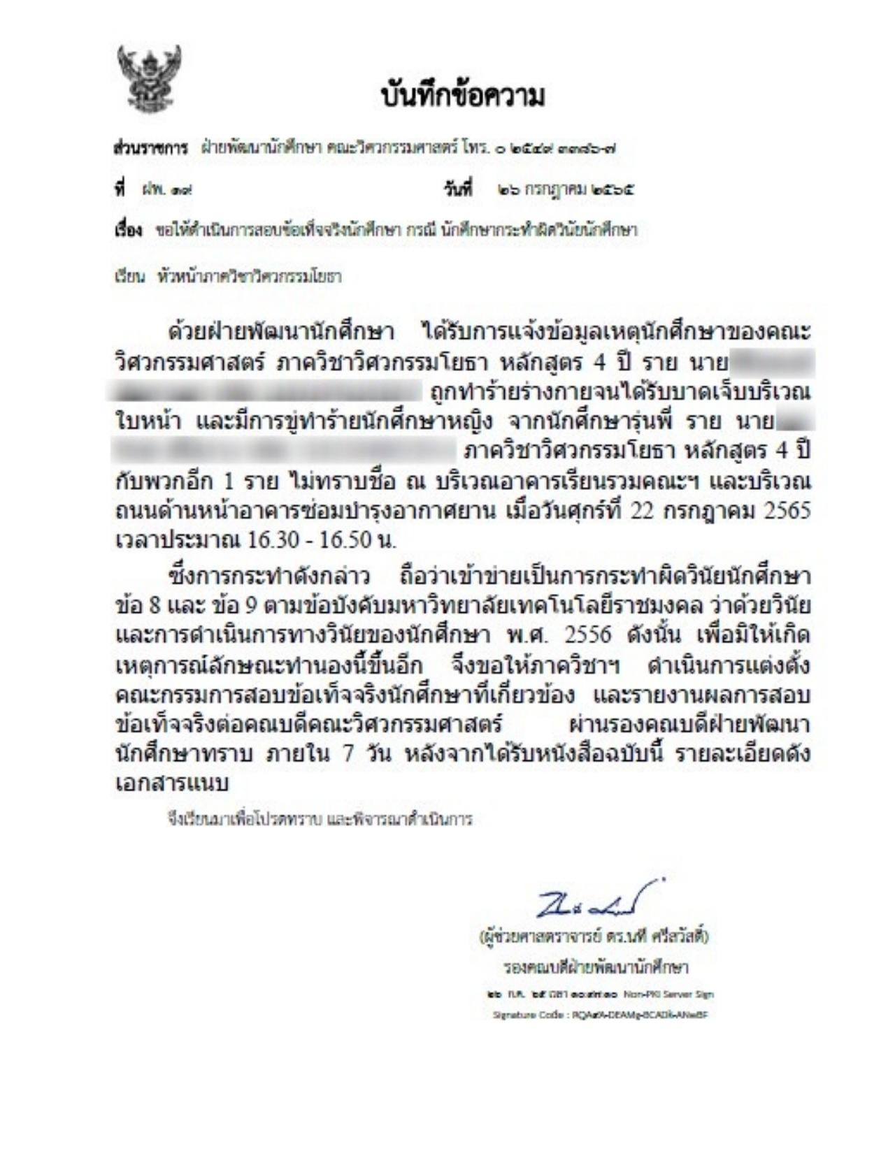 มหาวิทยาลัยเทคโนโลยีราชมงคล (มทร.) ธัญบุรี สั่งตั้งคณะกรรมการตรวจสอบข้อเท็จจริง ขีดเส้น 7 วันรายงานผล กรณีนักศึกษาชั้นปี 3 คณะวิศวกรรมศาสตร์ ถูกรุ่นพี่ปี 4 รุมทำร้ายร่างกาย ปมไม่พอใจ ไม่ให้ความร่วมมือเข้าร่วมกิจกรรมรับน้อง