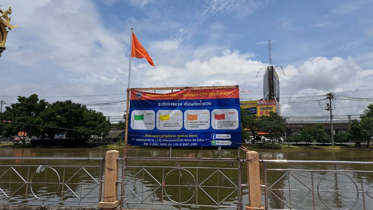 ผู้สื่อข่าวได้สำรวจจุดติดป้ายแจ้งเตือนระดับน้ำภายในคลองรังสิตประยูรศักดิ์ ที่ทางเทศบาลนครรังสิตได้ขึ้นป้ายเตือนไว้นั้น โดยการสังเกตจะดูตามสีของธง โดยระดับน้ำปกติจะเป็นธงสีเขียว ระดับน้ำมากกว่า 1.3 เมตร ให้ติดตามข่าวสารอย่างใกล้ชิด แต่ในตอนนี้ธงที่ติดนั้นเปลี่ยนเป็นสีส้ม คือระดับน้ำอยู่ในเกณฑ์ที่มีความเสี่ยงอันตราย ให้อพยพเคลื่อนย้ายทรัพย์สินขึ้นที่สูง ซึ่งจากการคาดการณ์ถ้าเย็นวันนี้มีฝนตกลงมาอีกก็จะทำให้ระดับน้ำในคลองรังสิตประยูรศักดิ์สูงขึ้น และอาจจะไหลเข้าท่วมพื้นที่ต่ำ และมีระดับน้ำสูงขึ้นอย่างต่อเนื่อง.