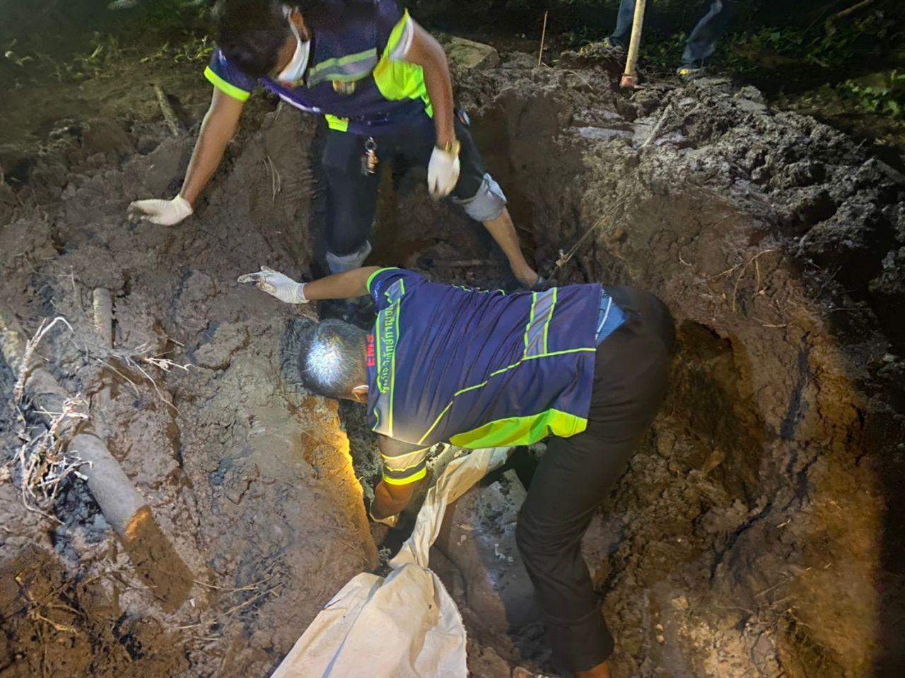 กาญจนบุรีฝนตก ดินผนังเตาเผาถ่านถล่มฝังร่างหนุ่มโป่งน้ำร้อน ที่ อ.ไทรโยค ฝังศพอยู่ใต้ดิน 3 วันส่งกลิ่น เมียสงสัย ร้อง จนท.ตรวจสอบ ขุดหาพบศพนั่งคู้เสียชีวิตในเตาเผาลึก 1 เมตรตายเพราะขาดอากาศ
