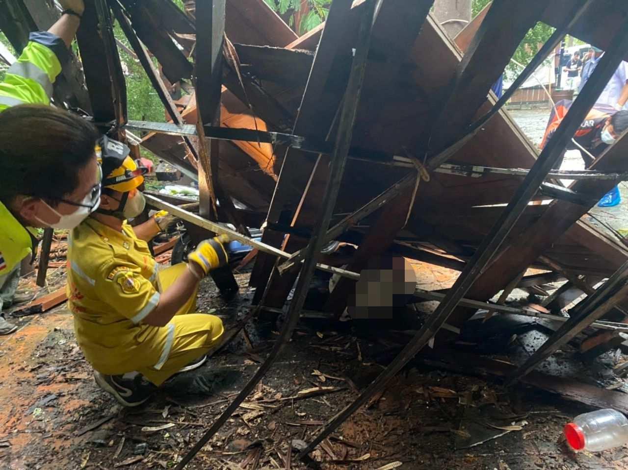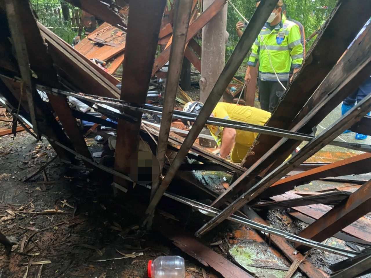 เมื่อเวลา 17.00 น.วันที่ 13 ก.ย.2565 พ.ต.ท.ฐานธิษณ์ แดนราศี สว.(สอบสวน) สภ.บางแก้ว ได้รับแจ้งมีบ้านไม้ถล่มลงมาทับผู้อาศัยติดภายในบ้านได้รับบาดเจ็บ ที่ท้ายซอยเมืองแก้ว ต.บางแก้ว อ.บางพลี จ.สมุทรปราการ จึงพร้อมด้วยเจ้าหน้าที่มูลนิธิร่วมกตัญญู รุดตรวจสอบที่เกิดเหตุ โดยที่เกิดเหตุ เป็นบ้านไม้ชั้นเดียวปลูกยกพื้นสูง ด้านหน้ามีนอกชานยื่นออกมาพังถล่มลงมา และมีบานประตูเข้าออกนอกชานและซากไม้นอกชานพังร่วงลงมาทับร่าง น.ส.อำพรรณ แสงบุญ อายุ 58 ปี ชาว จ.สมุทรปราการ ได้รับบาดเจ็บที่ศีรษะและลำตัวได้รับแรงกระแทก และติดกันพบ จักรยานยนต์ไฟฟ้า 1 คัน เจ้าหน้าที่ต้องช่วยกันรื้อซากไม้ออกและนำร่าง ผู้บาดเจ็บออกมาปฐมพยาบาลเบื้องต้นและนำส่งรักษาต่อที่ รพ.พริ้นซ์ เพื่อรักษาต่อไป
