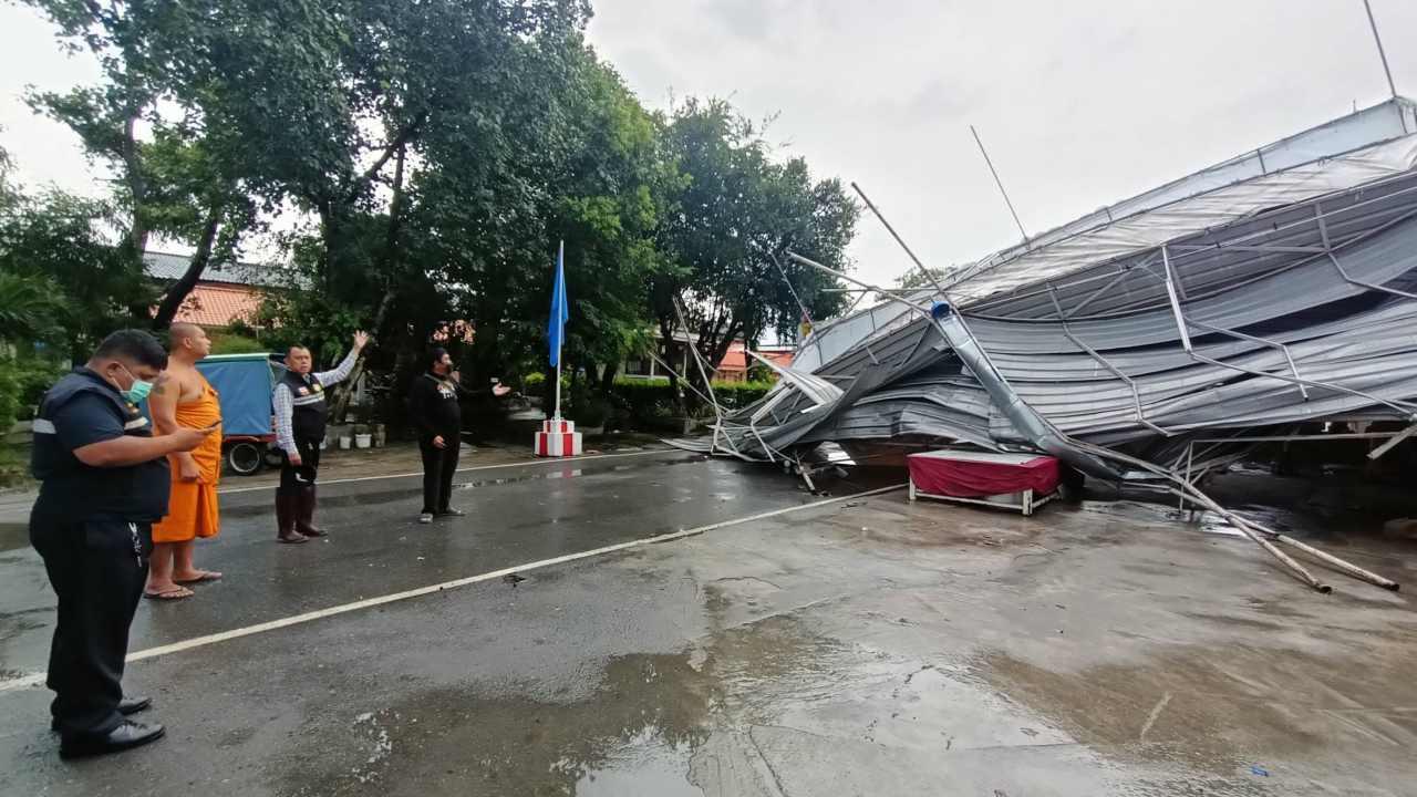 ลมฝนพัดถล่มพื้นที่ จ.ปทุมธานี ในช่วงเย็น พระในวัดที่คูคต ลำลูกกา เห็นคาตาลมพัดเต็นท์หน้าโบสถ์ตีลังกา หลังคาเปิดเสียหายหนัก มีชายได้รับบาดเจ็บศีรษะแตก นำส่ง รพ. 1 คน