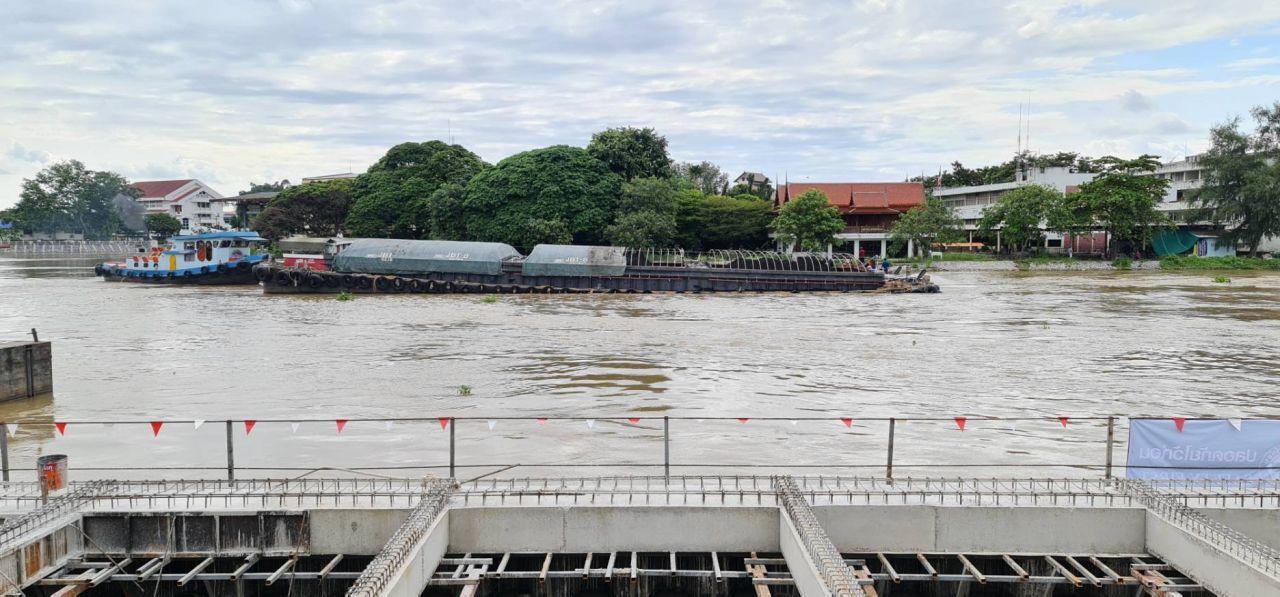 ขณะนี้มีการสั่งให้เรือบรรทุกสินค้าหยุดเดินเรือชั่วคราวเกิดเหตุเรือลากจูงได้นำเรือลำเลียงดังกล่าวผ่านโค้งแม่น้ำป่าสักบริเวณสามแยกวิทยาลัยฯ ก่อนเรือลำเลียงได้กระแทกเข้ากับบริเวณจุดก่อสร้างเขื่อนป้องกันตลิ่งของกรมเจ้าท่า จนทำให้เรือนั้นกลับชนกระแทกกันเองจนเกิดรอยรั่วบนเรือลำเลียงก่อนเกิดเหตุจมลง