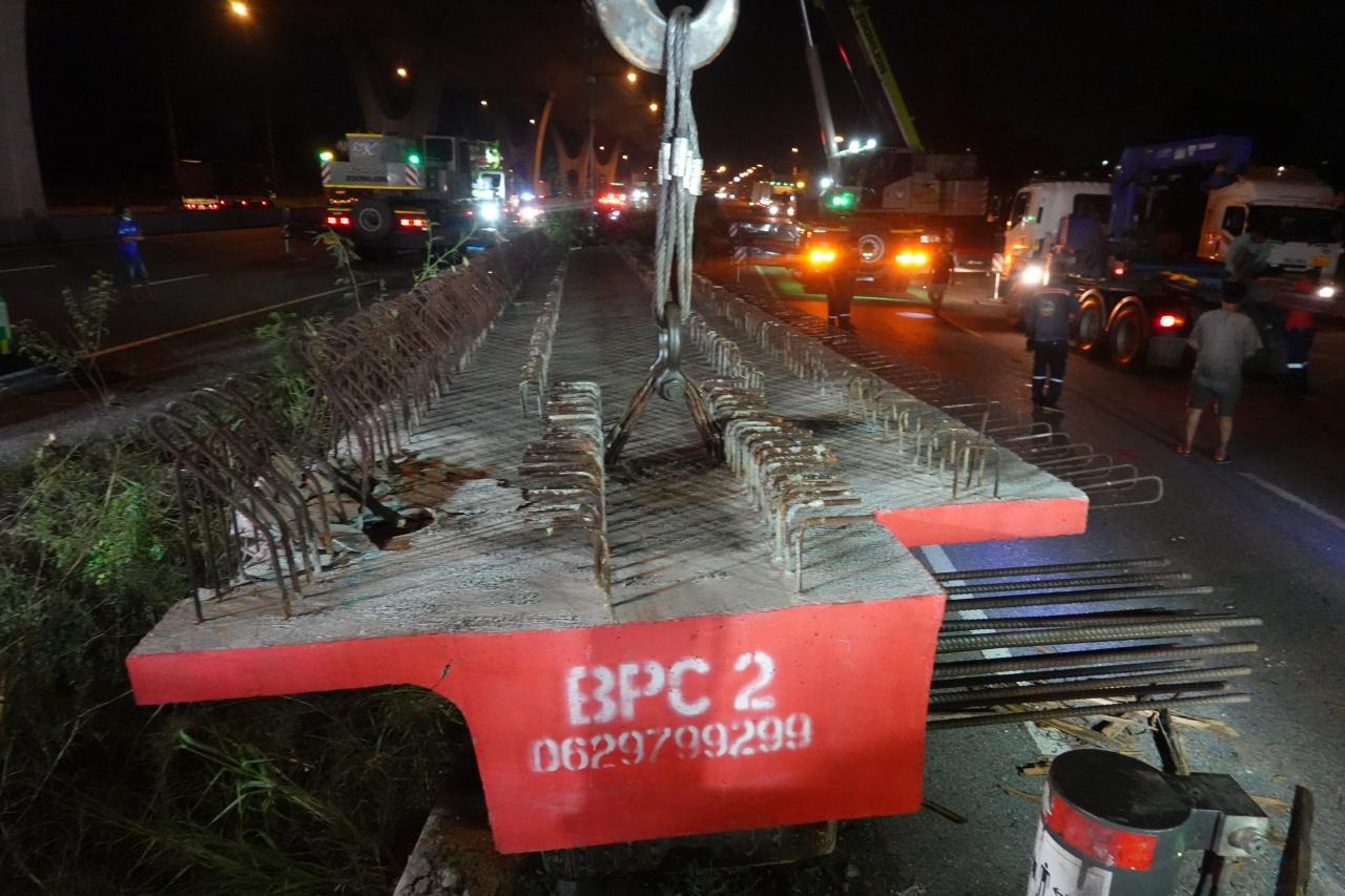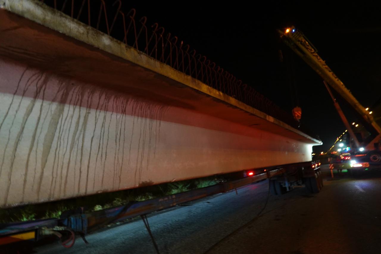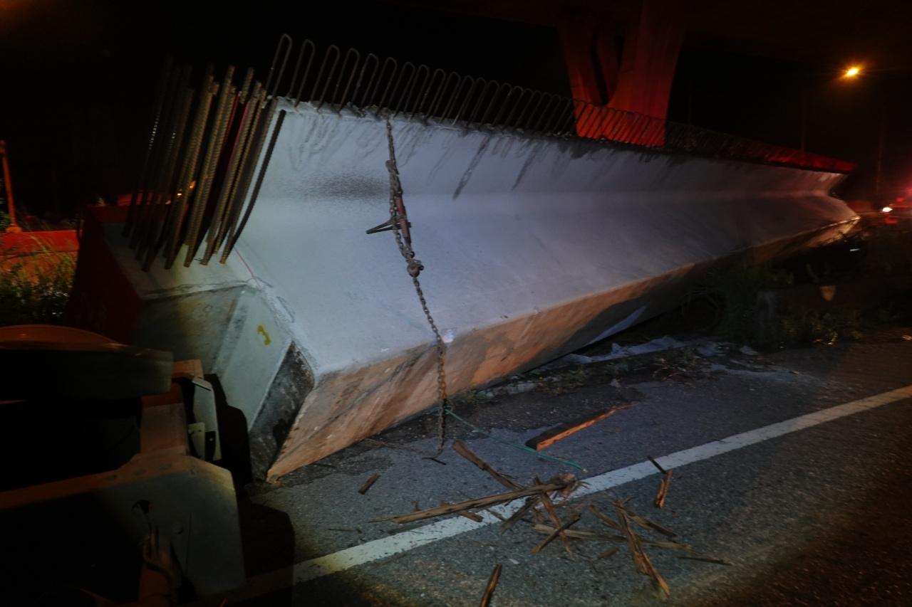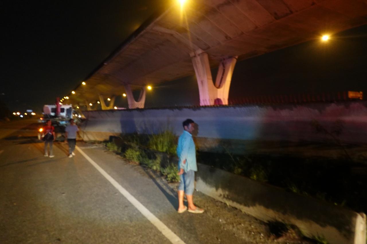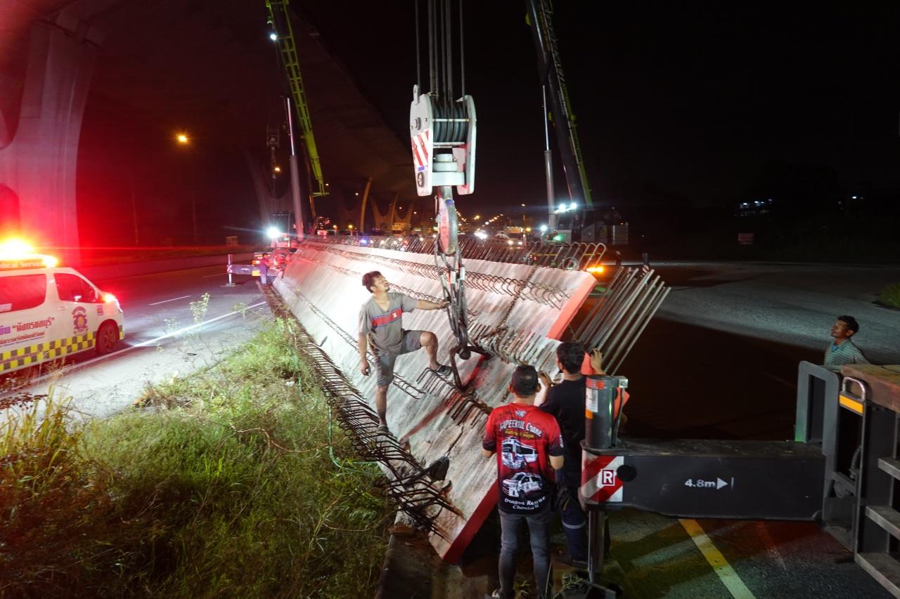ที่เกิดเหตุพบรถพ่วง 22 ล้อ ยี่ห้อฮีโน่ สีขาว ทะเบียนตัวแม่ 70-3850 ลพบุรี ทะเบียนตัวพ่วง 70-3851 ลพบุรี เสียหลักหลุดโค้งพุ่งชนแบริเออร์เกาะกลาง ก่อนจะตกลงร่องกลางถนนทำให้คานสะพานยาว 20 เมตร น้ำหนัก 75 ตัน ตกจากรถกีดขวางเลนซ้ายในช่องทางด่วน และกีดขวางเลนขวา ช่องคู่ขนาน เจ้าหน้าที่ต้องประสานรถเครนถึง 3 คัน ในการยกคานสะพานดังกล่าวออกจากช่องทางเดินรถทั้งหมด ก่อนจะนำขึ้นรถพ่วง 22 ล้ออีกคัน เพื่อนำกลับบริษัท
