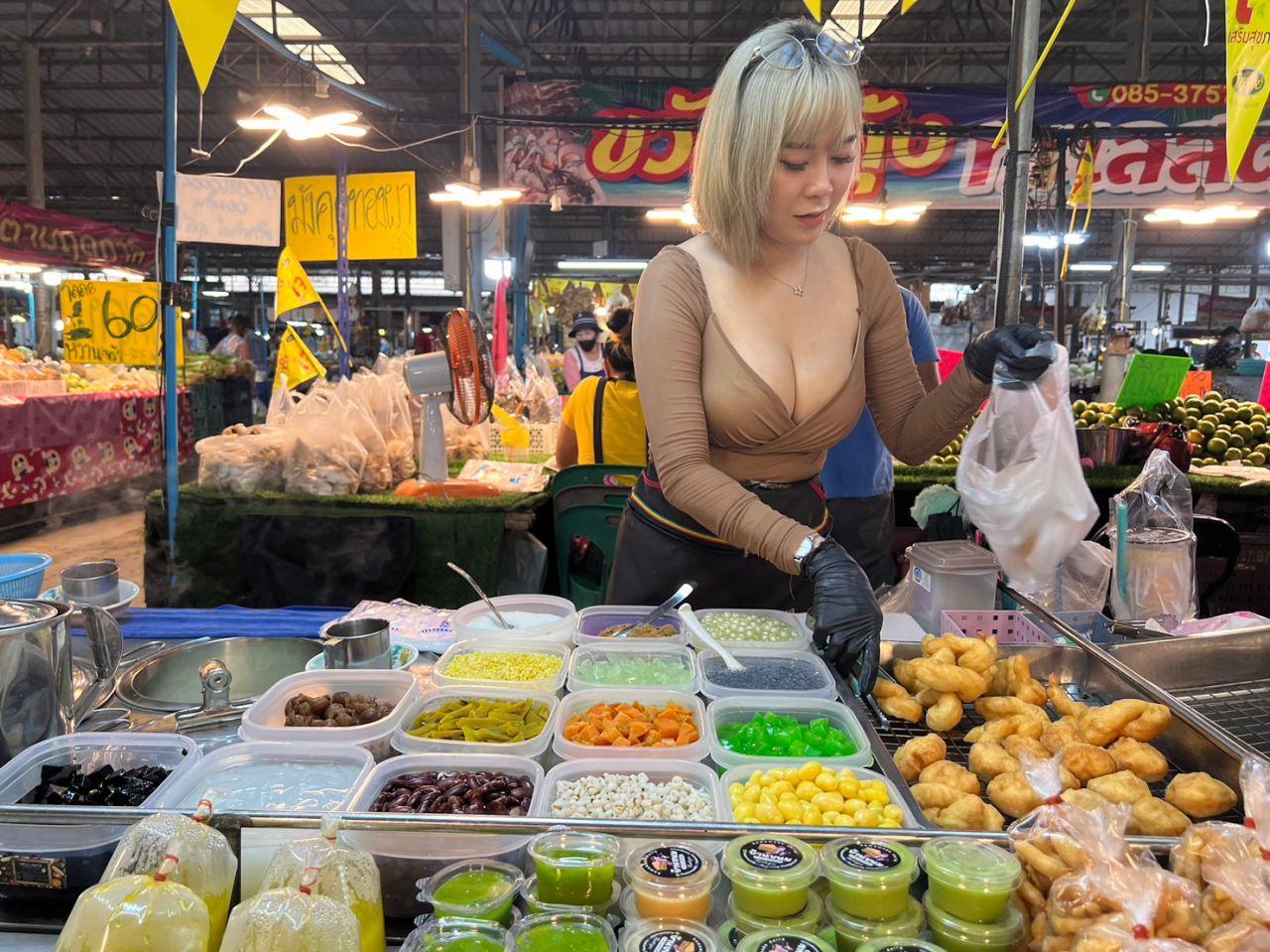 เมื่อเวลา 15.00 น.วันที่ 27 กันยายน 2565 ผู้สื่อข่าวรายงาน ที่ตลาดรุ่งโรจน์เจริญทรัพย์ หรือตลาดพระแท่น อำเภอท่ามะกา จังหวัดกาญจนบุรี มีแม่ค้าสาวสวยสุด เซ็กซี่ขายน้ำเต้าหู้เจเพื่อสุขภาพอยู่ร้านหนึ่ง มีชื่อร้านว่า "น้ำเต้าหู้แม่มด" ซึ่งร้านนี้ได้รับความนิยมจากพ่อบ้านหนุ่มๆ และชาวบ้านในละแวกนั้นเป็นอย่างมาก เนื่องจาก มีรสชาติที่อร่อยถูกปากแล้ว ยังมีเมนูเด็ดเป็นปาโก๋เกลียวที่ทอดใหม่ทุกวัน น้ำเต้าหู้ทรงเครื่อง น้ำขิง ชาร้อน ชาเย็น และช่วงเทศกาลกินเจนี้ก็จะมีน้ำฟักทองไว้คอยบริการ แต่ที่เด็ดกว่าน้ำเต้าหู้เห็นจะเป็นแม่ค้าร้านนี้มีชื่อว่า คุณมด หรือ น.ส.ชมพูนุช ณ สงขลา อายุ 29 ปี จะแต่งตัวสุดเซ็กซี่ยืนขายน้ำเต้าหู้ กับสีผมสีบลอนด์ รอยยิ้มหวานๆ ที่หนุ่มเดินผ่านหน้าร้านจะต้องแวะซื้ออุดหนุนทันที