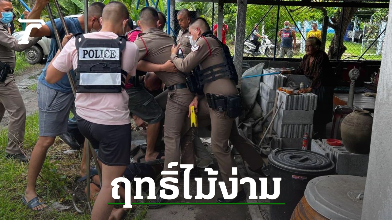 ตำรวจท่าวุ้ง ใช้อุปกรณ์ ไม้ง่าม สยบอดีตครูสติแตกคลุ้มคลั่ง ไล่ฟันพี่สะใภ้ แม่เฒ่าวัย 90 นั่งใกล้ๆ อ้อนวอนให้ลูกทิ้งมีด ตำรวจกล่อมไม่สำเร็จกลับถือมีดวิ่งเข้าใส่ ต้องสยบด้วยไม้ง่ามจับส่งโรงพยาบาล