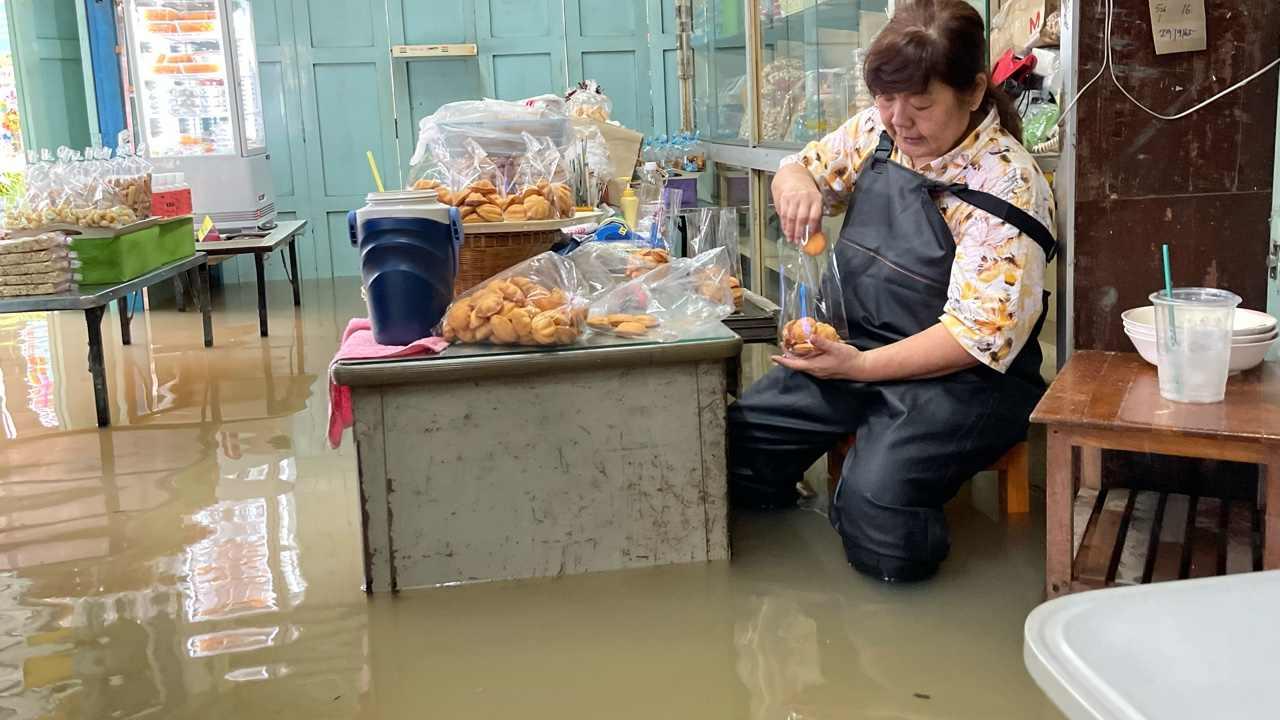 น.ส.สุนีย์ หรือเจ๊นิ สิทธิกรวงศ์ อายุ 65 ปี เจ้าของร้านขนมของฝากพื้นบ้าน ใกล้ท่าน้ำปากเกร็ด เผยว่าช่วงสายของวันนี้จู่ๆ เกิดระดับน้ำในแม่น้ำเจ้าพระยาเพิ่มสูงอย่างรวดเร็วกว่าทุกวันที่ผ่านมา อย่างไม่ทันตั้งตัว เคราะห์ดีที่เตรียมตัวย้ายข้าวของยกขึ้นที่สูงไปก่อนหน้านี้ จึงไม่มีทรัพย์สินเสียหาย ต้องเดินลุยน้ำขายของภายในร้าน มีระดับน้ำสูงกว่า 60 ซม. ด้วยความลำบาก ซึ่งทางเทศบาลนครปากเกร็ดได้ส่งเจ้าหน้าที่มาทำสะพานไม้ วางแนวกระสอบทรายให้ชาวบ้านที่พักอาศัยอยู่ภายในซอยใช้เดินเข้าออกอย่างสะดวก