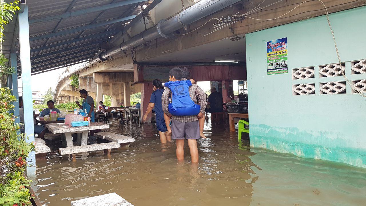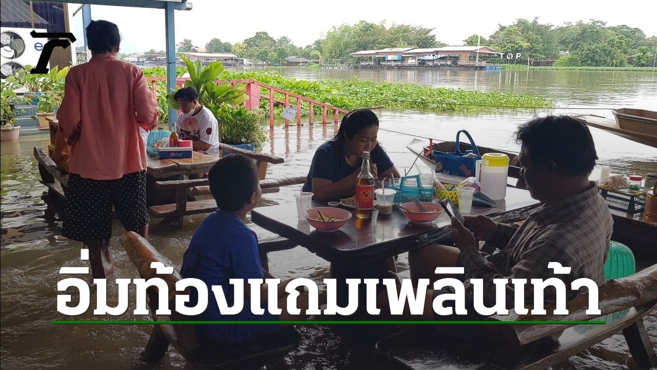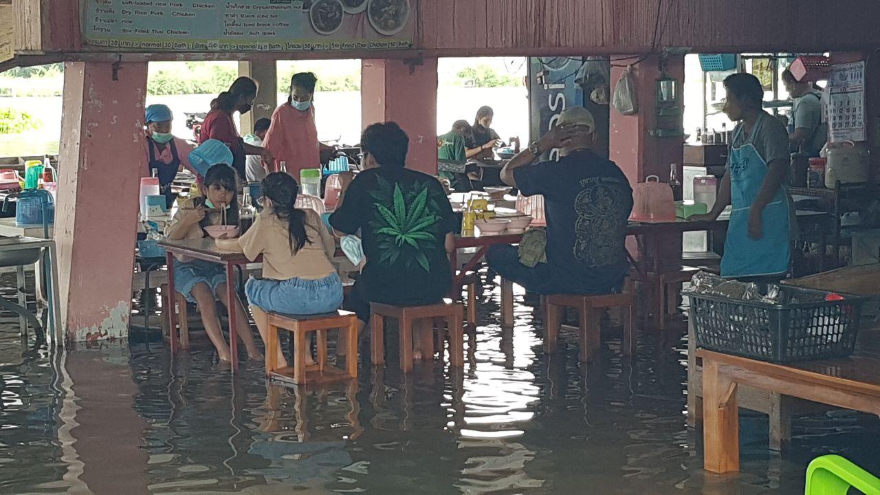 ขณะเดียวกัน ผู้สื่อข่าวได้ลงพื้นที่ไปยังร้านก๋วยเตี๋ยวไก่ป้าจิตร ซึ่งพบว่าบรรยากาศร้านก๋วยเตี๋ยวไก่ขณะนี้ น้ำท่วมร้านสูงขึ้นประมาณหัวเข่าแล้ว ขนาดความสูงประมาณ 30 เซนติเมตรแล้ว แต่ลูกค้าร้านก๋วยเตี๋ยวไก่ก็ไม่หวั่น นั่งกินก๋วยเตี๋ยวไก่กันแบบชิลๆ และได้บรรยากาศไปอีกแบบ