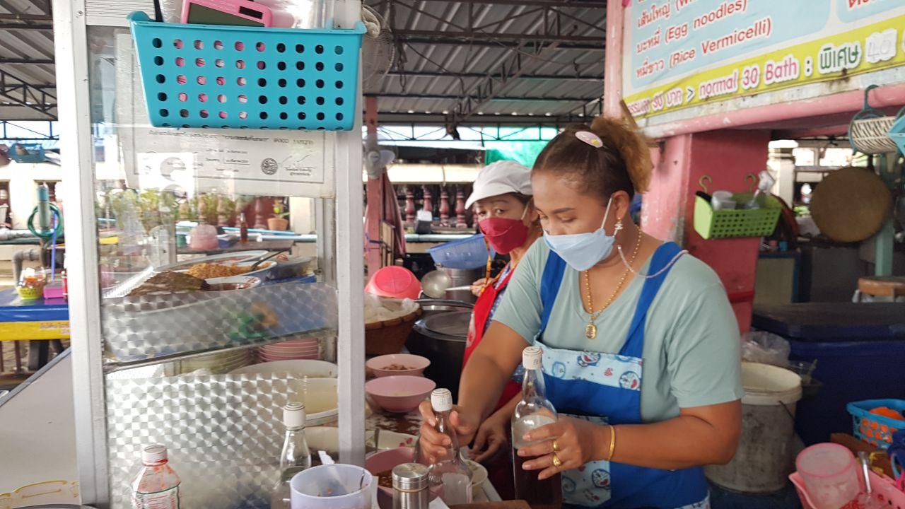 จากการสอบถาม นางสาวพรกมล ปรางเปรมปรี อายุ 44 ปี เจ้าของร้านก๋วยเตี๋ยวไก่ป้าจิตร หรือปุ้ยก๋วยเตี๋ยวไก่ ทายาทของแม่สมจิตร ได้เปิดเผยว่า ถือเป็นรอบ 10 ปีตั้งแต่ปี 2554 ที่เคยเกิดน้ำท่วมหนัก โดยปีที่แล้วและปีนี้ก็รับผลกระทบไปตามๆ กันจากฝนตกน้ำท่วมขังและน้ำทะเลหนุนสูง ปีนี้เกิดหนักหน่วงมาก น้ำขึ้นสูง 30-40 เซนติเมตรแล้ว แต่ทางร้านก็ไม่หวั่น ขอพลิกวิกฤติเป็นโอกาส น้ำขึ้นให้รีบตัก รีบตักจริงๆ ค่ะ วิกฤติเป็นโอกาสมาแล้ว ไหนๆก็ไหนๆ ทั้งแม่ค้าและลูกค้าก็ได้กินก๋วยเตี๋ยวในบรรยากาศสไตล์ใหม่ มีปลามาตอดเท้าด้วย บางคนลูกหลานชอบนอกจากมากินก๋วยเตี๋ยวแล้วยังมาได้เลี้ยงปลาและมาดูปลา ลูกค้าหลายคนชอบบรรยากาศแบบนี้ ชอบลุยน้ำและสไตล์เกือบจะเหมือนการทำสปาเท้าไปในตัว เพราะมีปลาตัวเล็กๆ จะตอดเท้าไว้ตลอดเวลา