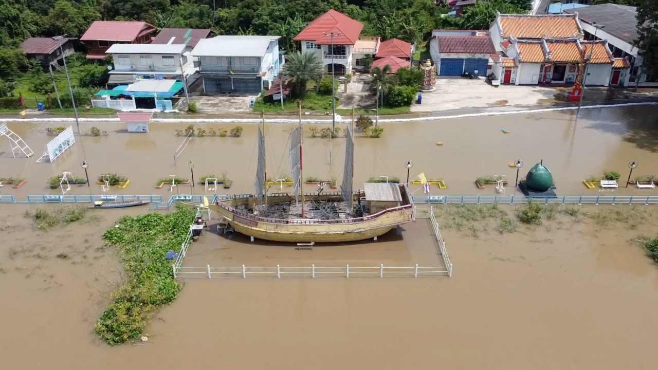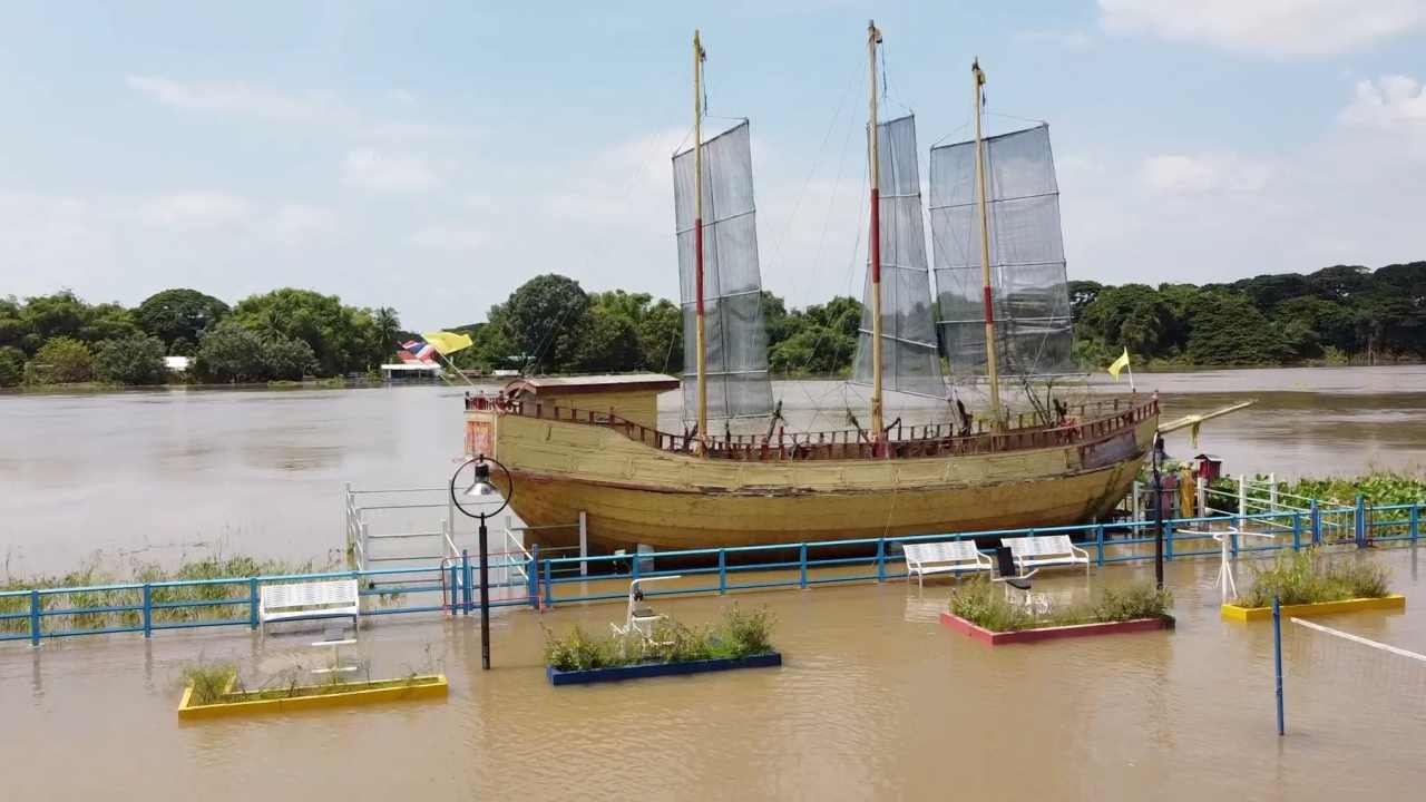 เวลา 16.00 น. วันที่ 13 ตุลาคม 2565 จากภาพมุมสูงเผยให้เห็นภาพของเรือสำเภาโบราณ ที่ดูเหมือนกำลังโลดแล่นอยู่ในแม่น้ำเจ้าพระยา บริเวณหน้าศาลเจ้าพ่อกวนอู ตลาดเก่าร้อยปีคุ้งสำเภา อ.มโนรมย์ จ.ชัยนาท ซึ่งปกติเรือลำนี้จะถูกจัดวางอยู่บนคาน เพื่อให้นักท่องเที่ยวได้มาชมและศึกษาเกี่ยวกับเรือสำเภา ที่คนสมัยก่อนใช้ในการเดินทางค้าขาย แต่เมื่อระดับน้ำในแม่น้ำเจ้าพระยาเอ่อล้นตลิ่งขึ้นมา จนถึงเรือสำเภาทอง จึงเกิดภาพที่ดูเหมือนเรือลำดังกล่าวกลับลงน้ำอีกครั้ง