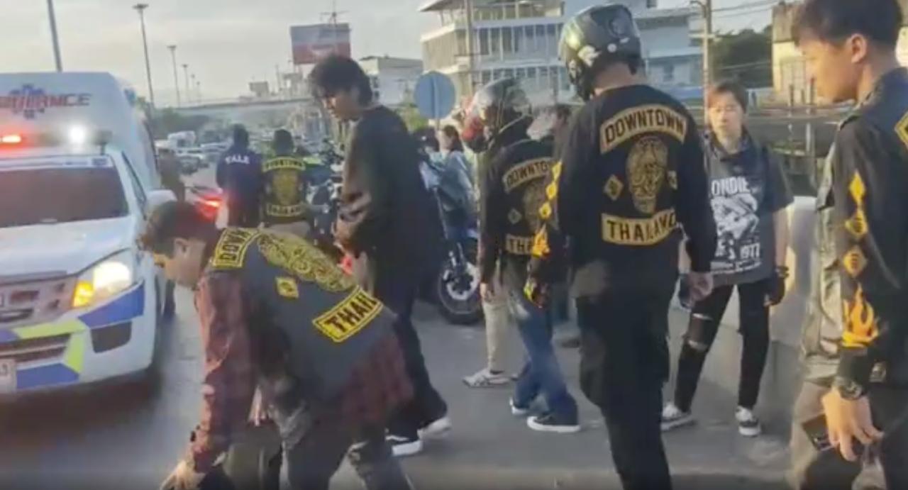 ผู้สื่อข่าวรายงานอีกว่า เพื่อนในขบวนรถจักรยานยนต์ที่มาด้วยกันใส่เสื้อกลุ่ม Downtown Mc Thailand