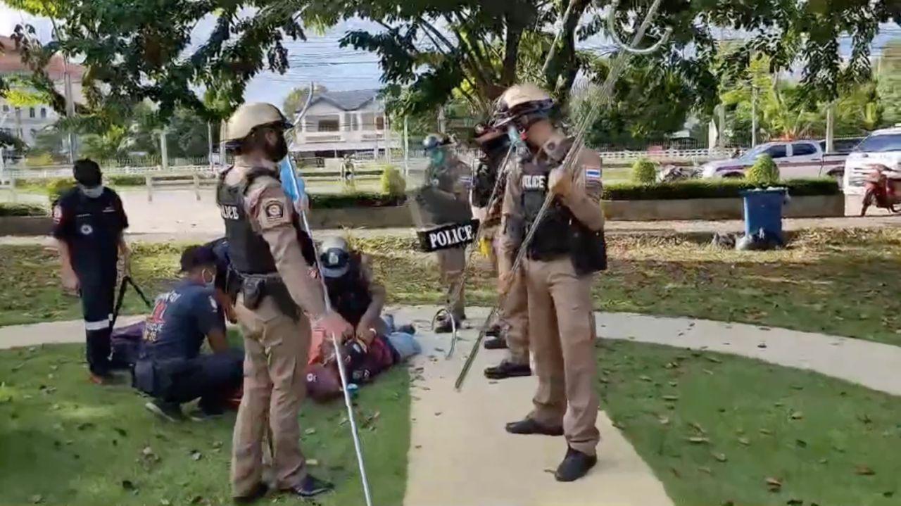 ทางเจ้าหน้าที่ตำรวจเมื่อถึงที่เกิดเหตุ จึงได้เข้าระงับเหตุ โดยใช้ปืนไฟฟ้ายิงใส่ตัวชายที่อาละวาดอยู่จากนั้นได้จู่โจมโดยการใช้ไม้ง่ามเหล็กกดตัวชายคนดังกล่าวลงไปให้สงบนิ่งแล้วนำส่งโรงพยาบาลเพื่อรักษาอาการต่อไป