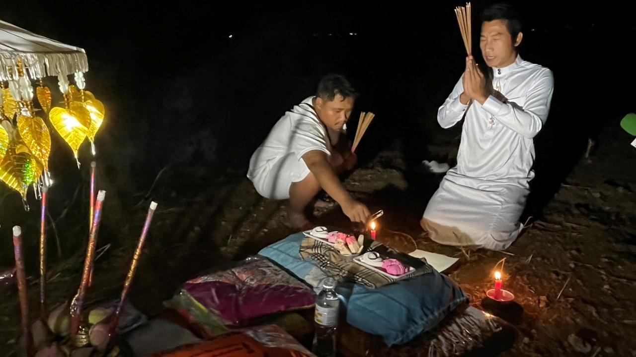 ทำพิธีบวชผีริมเขื่อนศรีนครินทร์ เรียกวิญญาณ "น้องมาวิน" ขอให้ขึ้นจากน้ำในวันพรุ่งนี้ ขนลุกขณะทำพิธีลอยถาดไฟ "นกแสก 3 ตัว" บินวนรอบร้องเสียงดัง "อาจารย์เจ" เผยสัมผัสผู้หญิงอยู่ในเมืองแม่ม่าย ไม่ยอมให้น้องขึ้นมาจากน้ำ-แถมเจอวิญญาณผู้ชายอีก 12 ตน อยู่ในเมืองใต้น้ำ