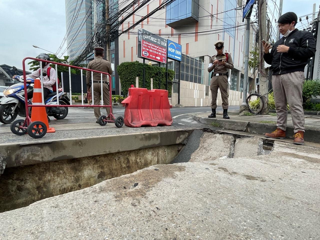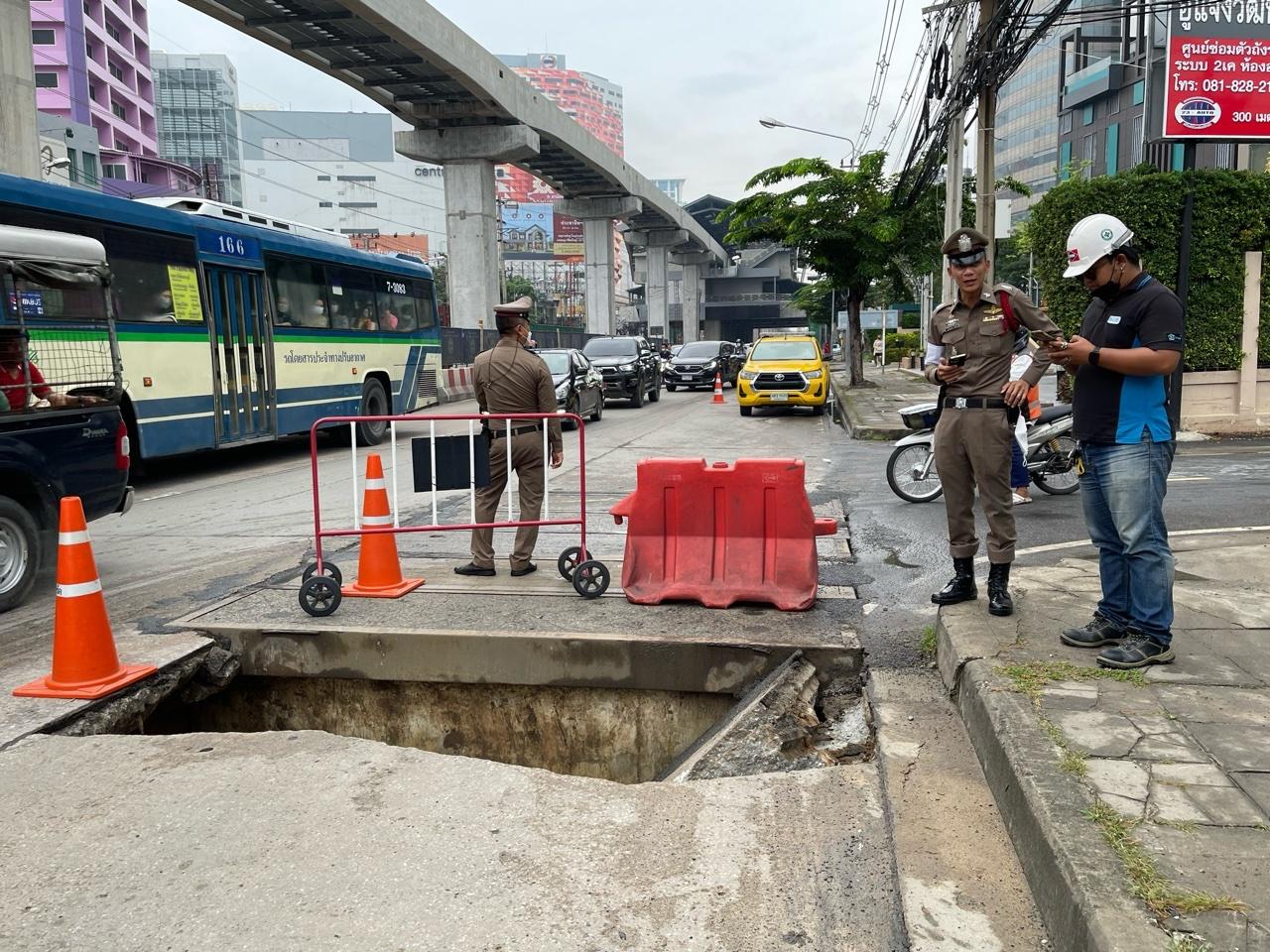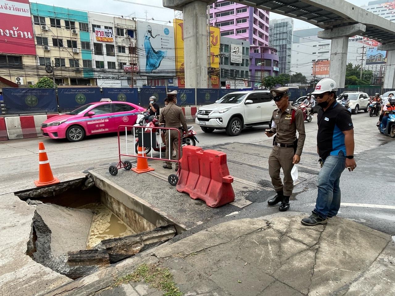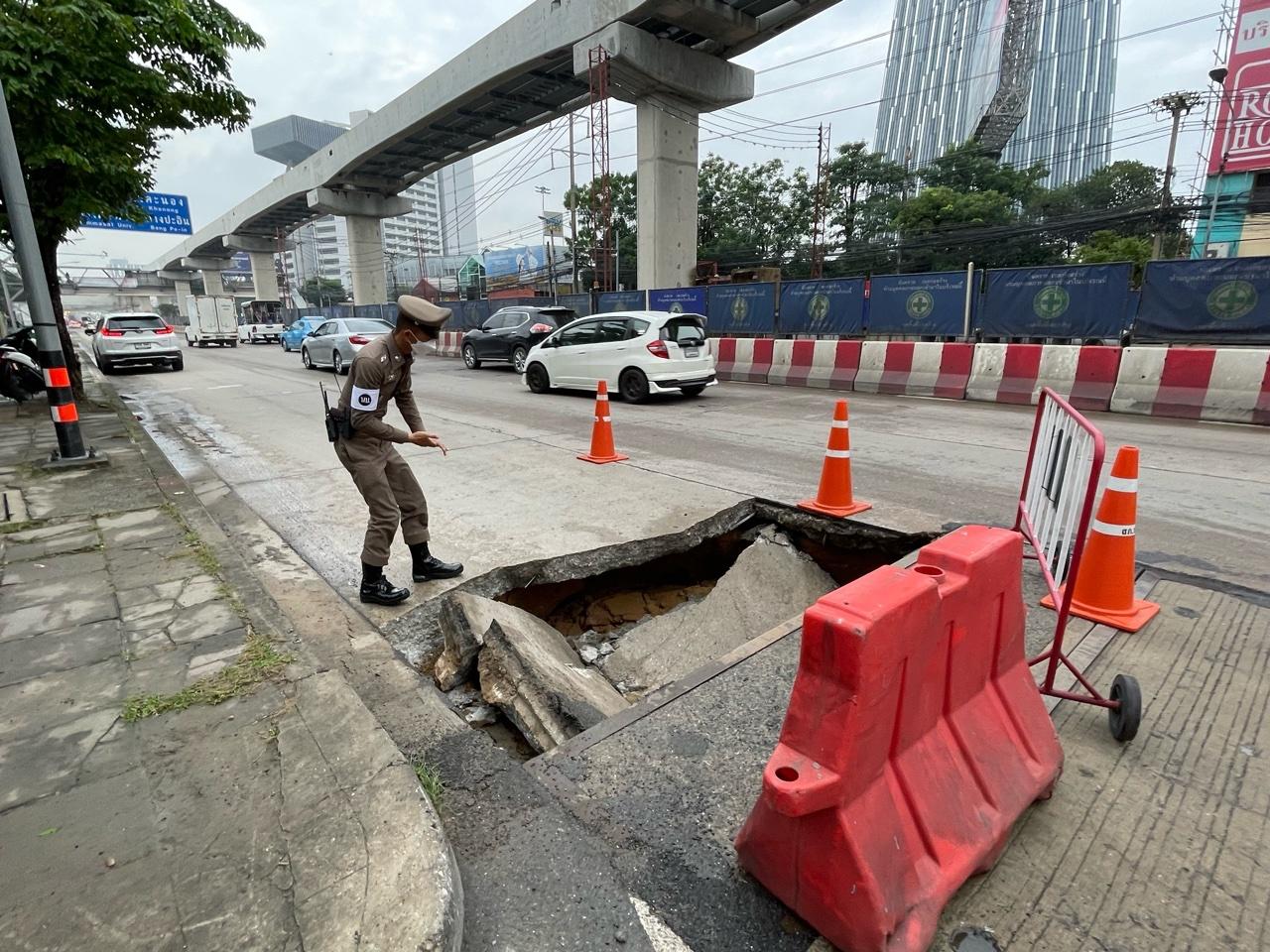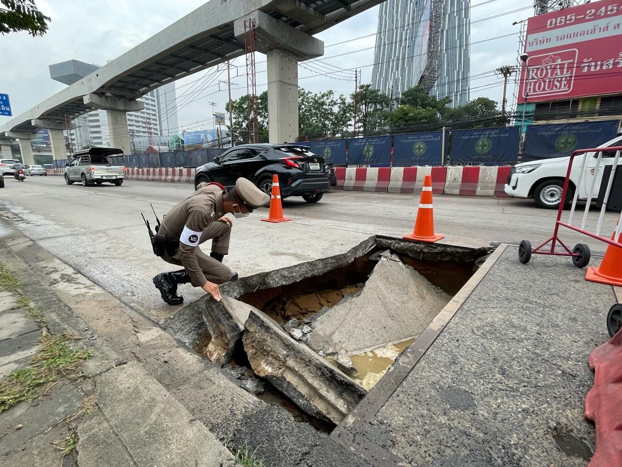 โดยทางเจ้าหน้าที่ตำรวจจราจร สภ.ปากเกร็ด จำนวน 3 นาย คอยอำนวยการจราจรเร่งระบายรถ ทั้งนี้ พ.ต.ท.ฐาปนพงษ์ พึ่งมี สว.จร.สภ.ปากเกร็ด กล่าวว่า เหตุการณ์พื้นถนนยุบตัวเกิดขึ้นเมื่อช่วงเวลา 06.30 น.ที่ผ่านมา ซึ่งบริเวณดังกล่าวเป็นจุดที่มีการก่อสร้างโครงการบ่อพักสำหรับร้อยท่อสายไฟฟ้าลงใต้ดิน