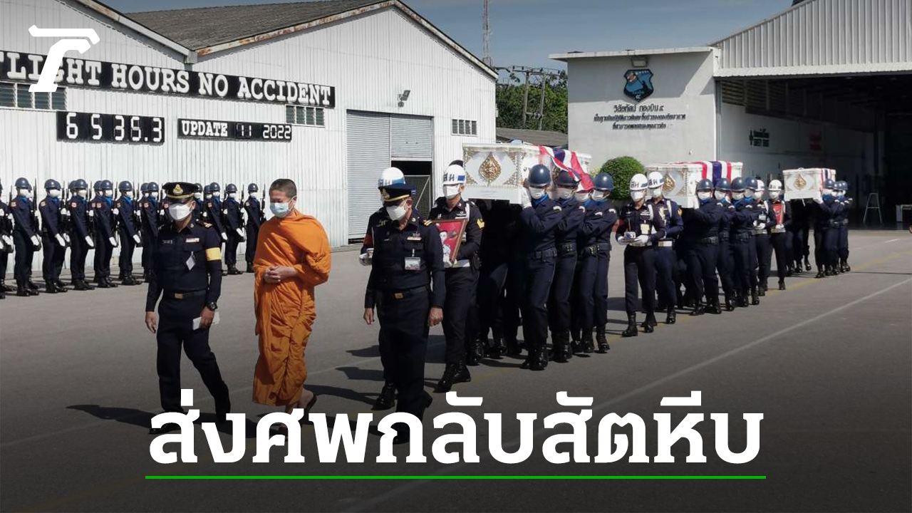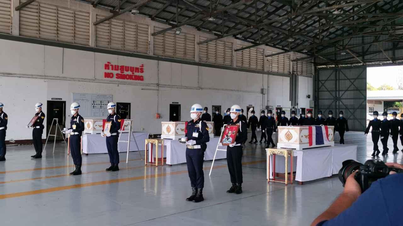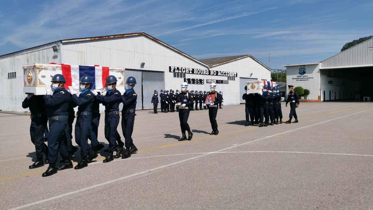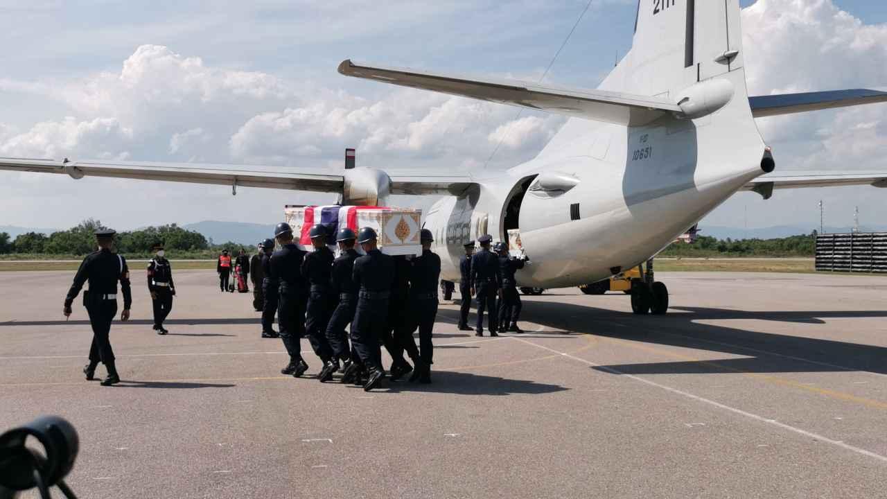โดยทหารอากาศเดินถือกระถางธูปและรูป ด้านหน้าโลงศพ พร้อมนำโลงศพคลุมด้วยธงชาติไทย และญาติ เดินขึ้นเครื่องบิน เอฟ-27 ฟอกเกอร์ ของกองทัพเรือ ไปยังสนามบินอู่ตะเภา เพื่อประกอบพิธีอย่างสมเกียรติต่อไป โดยเครื่องบินได้ทะยานขึ้นจากรันเวย์ในเวลา 14.10 น.
