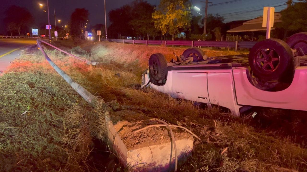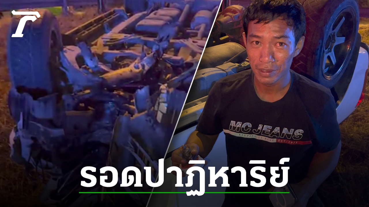 ใครเห็นก็คิดว่าตาย หนุ่มควบกระบะชนเสาไฟฟ้าหักโค่น รถพลิกคว่ำหงายท้อง ล้อชี้ฟ้า สภาพพังยับ แต่คนขับไร้รอยขีดข่วน นั่งสบายอารมณ์ริมถนน เชื่อบารมี "หลวงพ่ออุทัยตาทิพย์"