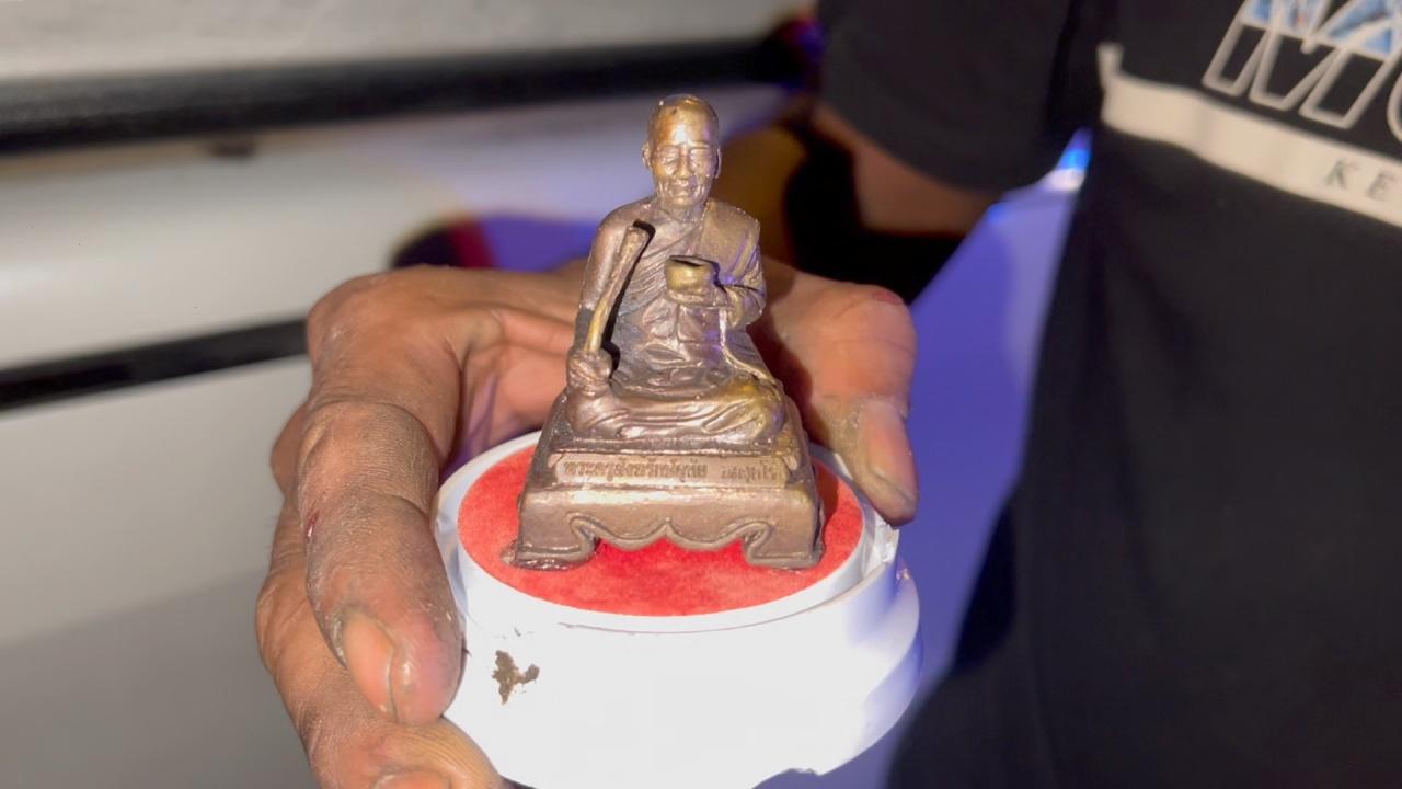 ในที่เกิดเหตุ พบรถกระบะอีซูซุ ดีแม็กซ์ สีขาว ทะเบียน ผจ 5053 นครปฐม พลิกคว่ำล้อชี้ฟ้า สภาพพังยับทั้งคัน ตกอยู่ที่กลางถนน เสาไฟฟ้าส่องสว่างหักโค่นอยู่ข้างรถ เจ้าหน้าที่เร่งหาผู้ได้รับบาดเจ็บที่อาจจะติดภายใน เพราะสภาพรถนั้นพังยับเละทั้งคัน ปรากฏว่า ชายที่นั่งอยู่เกาะกลางถนน คือคนขับ ทราบชื่อ นายพัฒนา สีพิมพ์ อายุ 35 ปี ชาวพิจิตร นั่งสบายอารมณ์ ไม่มีแม้รอยขีดข่วน เชื่อเป็นบารมีของรูปเหมือนหลวงพ่ออุทัยตาทิพย์ พระครูสังฆรักษ์อุทัย ปภงฺกโร วัดเกาะตาพุด (วัดศรีมฤคทายวัน) จ.ราชบุรี ที่วางไว้หน้ารถ