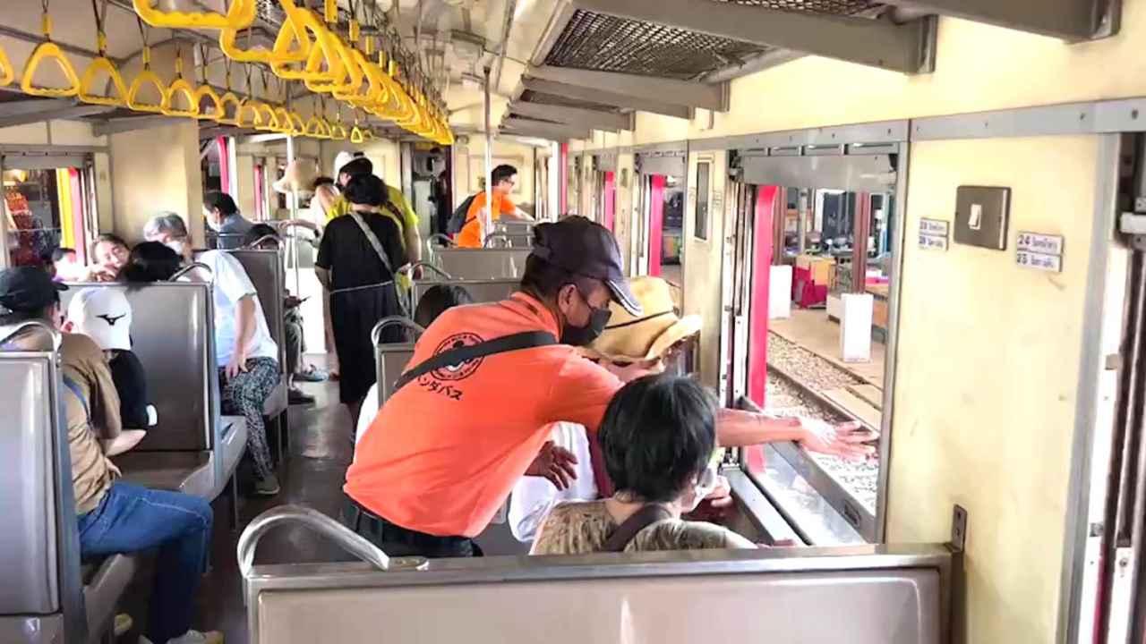โดยตลอดเวลาที่รถไฟเข้าสู่สถานี มีนายเจริญ เจริญพรรณ นายสถานีรถไฟสายแม่กลอง พร้อมเจ้าหน้าที่รถไฟ และตำรวจท่องเที่ยว คอยอำนวยความสะดวก และดูแลความปลอดภัยไม่ให้นักท่องเที่ยวยืนเลยเส้นความปลอดภัยที่สถานีรถไฟกำหนดไว้ อย่างไรก็ตามเมื่อรถไฟมาถึงสถานีก็มีนักท่องเที่ยวอีกส่วนหนึ่งที่ขึ้นรถไฟจากสถานีลาดใหญ่ มาลงที่สถานีแม่กลองอีกจำนวนมากด้วย ทำให้สถานีแห่งนี้แน่นขนัดไปด้วยนักท่องเที่ยวจำนวนมาก