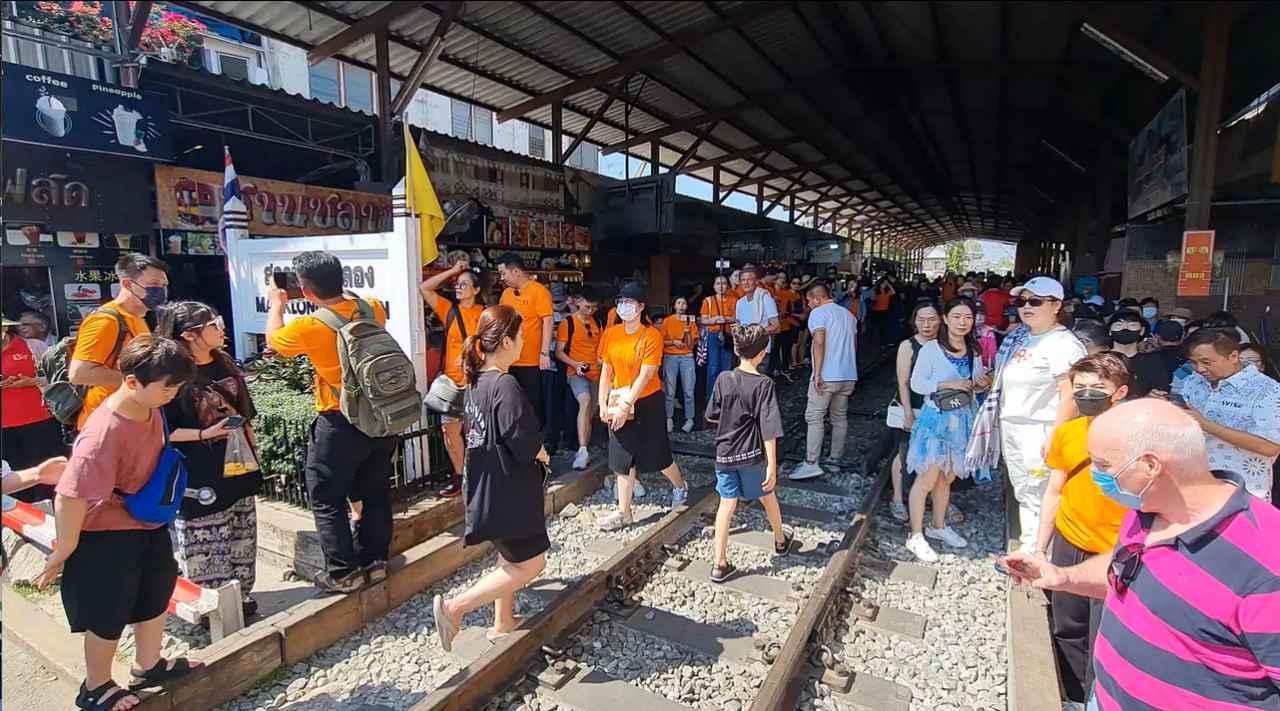 บรรยากาศที่สถานีรถไฟแม่กลองแทบแตก หลังกลุ่มชาวจีนกลุ่มแรกแห่เที่ยวตลาดร่มหุบ ยืนดูรถไฟเข้าสถานีพร้อมกับการเก็บร้านค้าเนืองแน่น 2 ข้างทางรถไฟ เพื่อเก็บภาพความมหัศจรรย์ของตลาดแห่งนี้