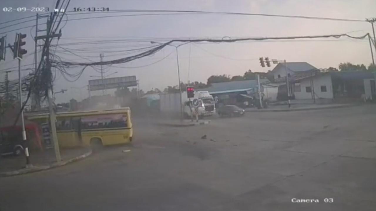 ภาพจากวงจรปิด นาทีระทึก ขณะรถเทรลเลอร์ ฝ่าไฟแดง เฉี่ยวชนรถบัสรับส่งนักเรียน หมุนเคว้ง ครูคนขับกระเด็นออกมานอกรถบาดเจ็บ นักเรียนเจ็บเล็กน้อย 1 ที่เหลือปลอดภัย
