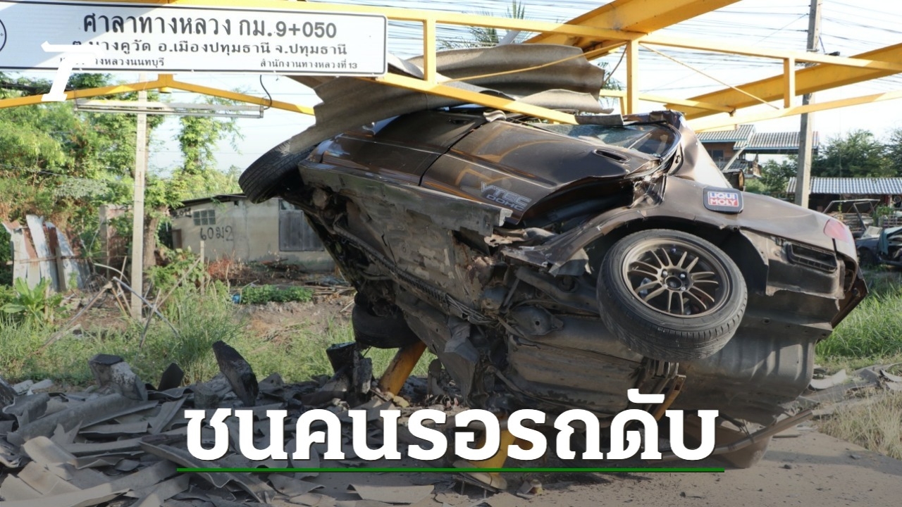หนุ่มร้อยเอ็ดควบเก๋งพุ่งชนป้ายรถเมล์ในเมืองปทุมธานี สาวพม่าเลิกงานนั่งรอแฟนมารับ โดนชนขาขาดดับสลด ส่วนคนขับบาดเจ็บสาหัส รถเก๋งพังยับเป็นซากคาป้ายรถเมล์