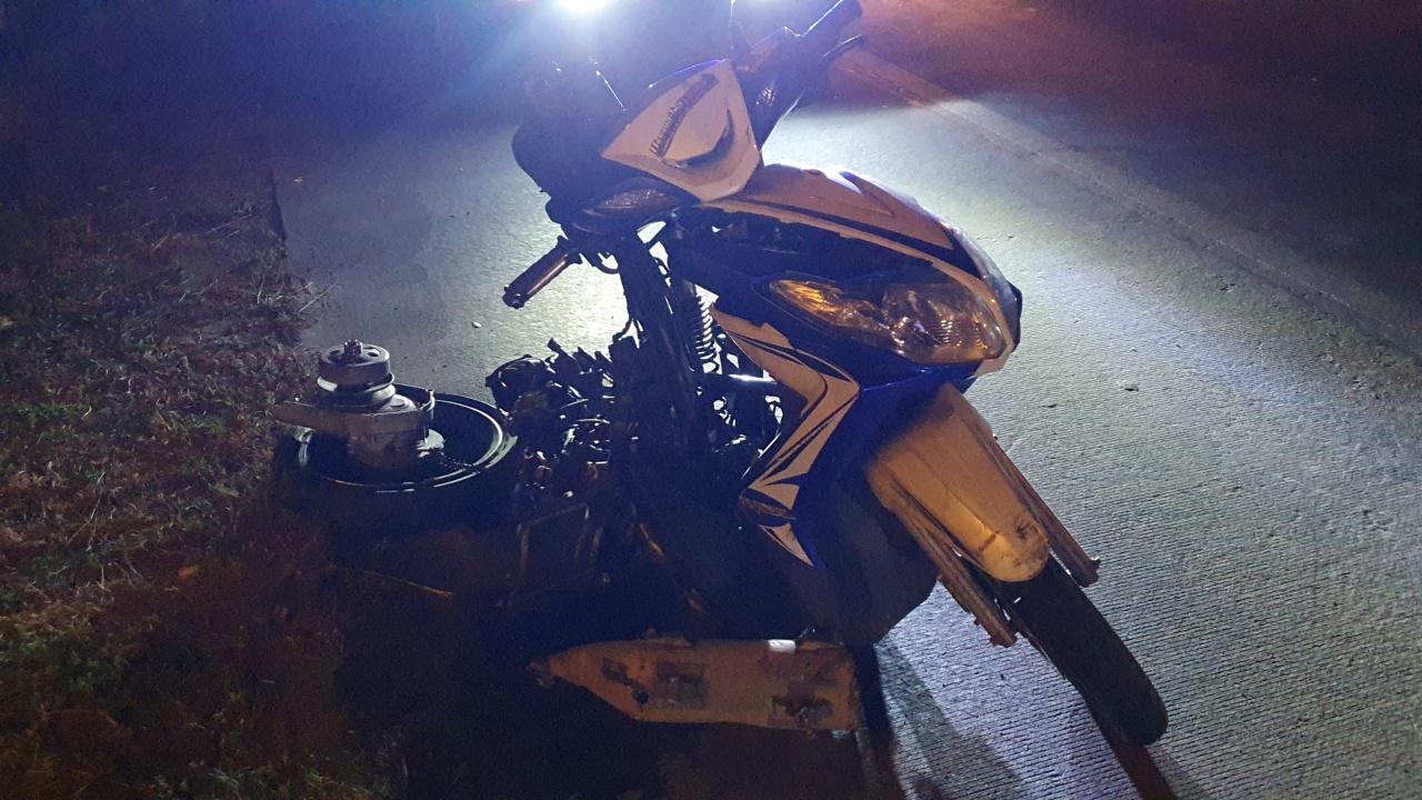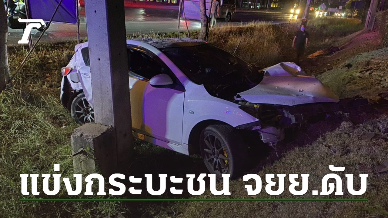 เก๋งชน จยย. พลิกคว่ำ 1 ตลบ ฟาดเสาไฟฟ้า เจ็บ 1 ตาย 1 ตำรวจเผยเก๋งซิ่งแข่งกระบะ-พุ่งเสยท้าย จยย.กระเด็นไกลร่วม 100 เมตร