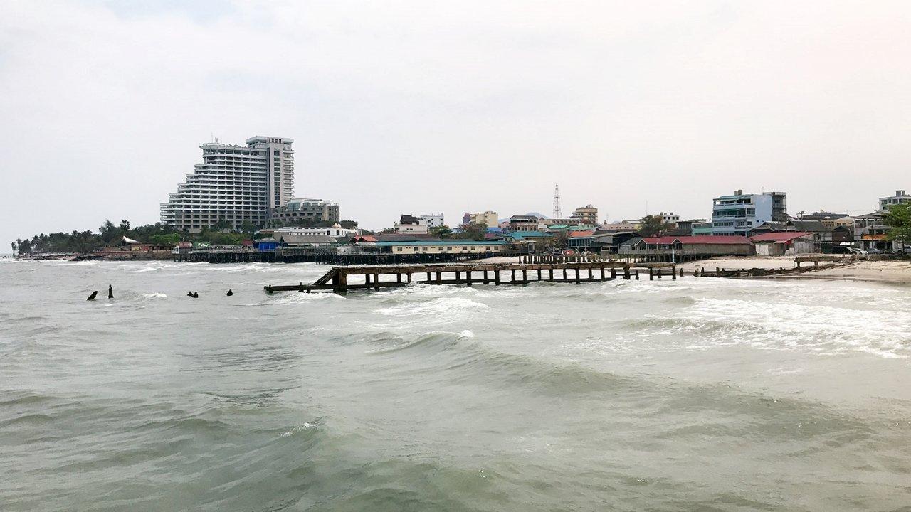 บรรยากาศที่ชายหาดหัวหิน จ.ประจวบคีรีขันธ์ ขึ้นธงแดง ห้ามนักท่องเที่ยวลงเล่นน้ำทะเลเพราะคลื่นลมแรง เช่นเดียวกับบริเวณท่าเทียบเรือสะพานปลาหัวหิน เรือประมงเล็กชายฝั่งจำนวนมากต่างงดออกจากฝั่ง