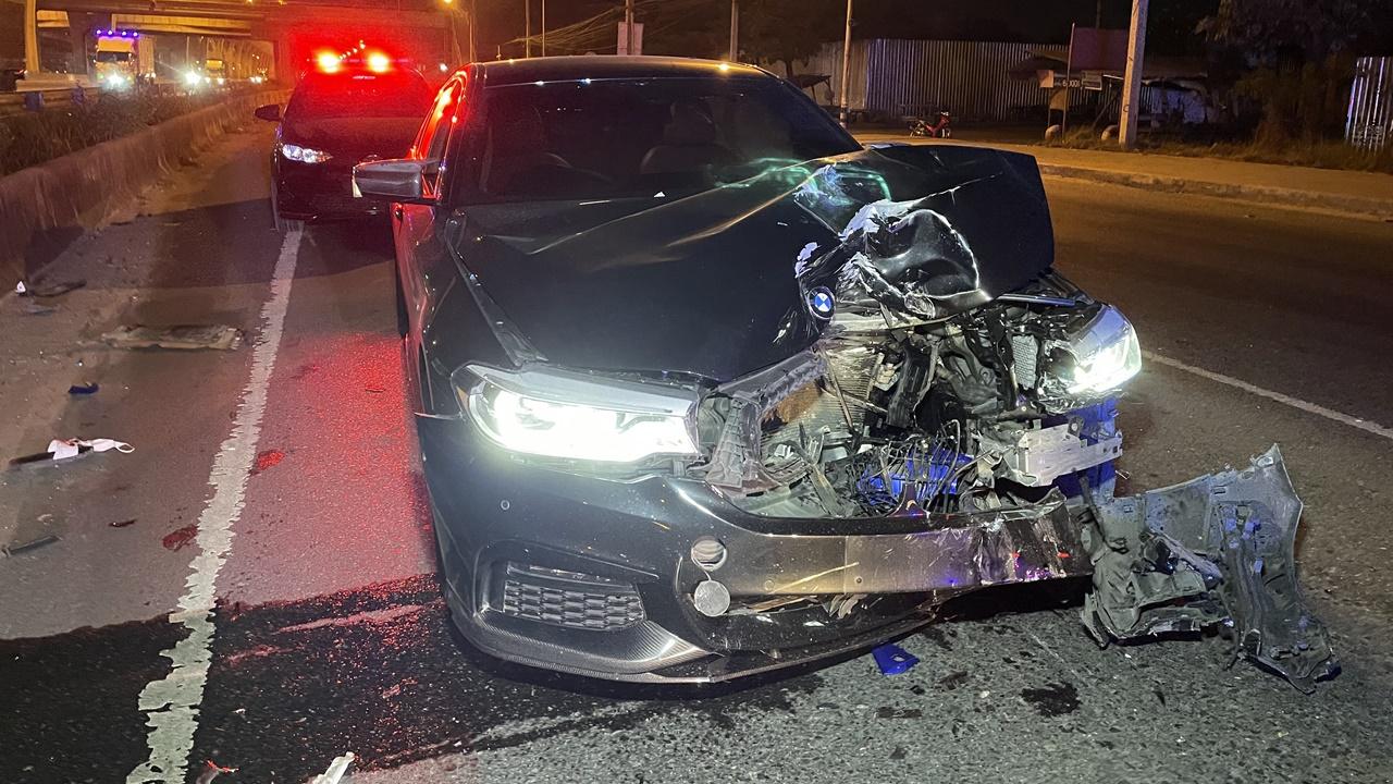 ถัดไปพบรถยนต์เก๋งคู่กรณี ยี่ห้อ BMW สีดำ รุ่น 520 P หมายเลขทะเบียน 8 กฮ 9710 กรุงเทพมหานคร จอดอยู่ชิดเลนขวา ในสภาพช่วงหน้ารถพังยับจากแรงกระแทกอย่างแรง กันชนหน้าแตกกระจายหลุดหาย ถุงลมนิรภัยฝั่งคนขับระเบิดออกมา