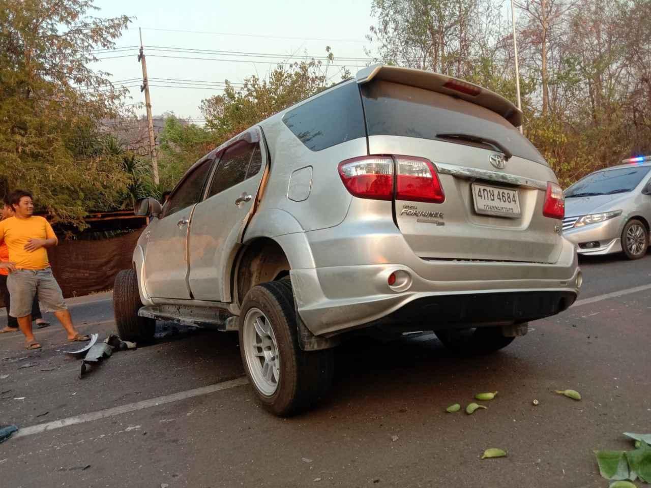 ในที่เกิดเหตุบนถนนพบ รถยนต์ยี่ห้อโตโยต้า รุ่นฟอร์จูนเนอร์ สีบรอนซ์ หมายเลขทะเบียน 4กษ 4684 กทม. สภาพด้านหน้าฝั่งขวาพังยับล้อหน้าขวาหลุด ฝากระโปรงยับยู่ยี่ เศษชิ้นส่วนกระจัดกระจาย จอดขวางทางช่องจราจรเลนซ้าย ทราบชื่อคนขับ คือ นายชาญชัย บัวขจร อายุ 60 ปี ชาวตำบลวังศาลา อ.ท่าม่วง จ.กาญจนบุรี ได้รับบาดเจ็บแน่นหน้าอกกระแทกกับพวงมาลัยรถ ถูกกดทับจากคอนโซลหน้ารถ
