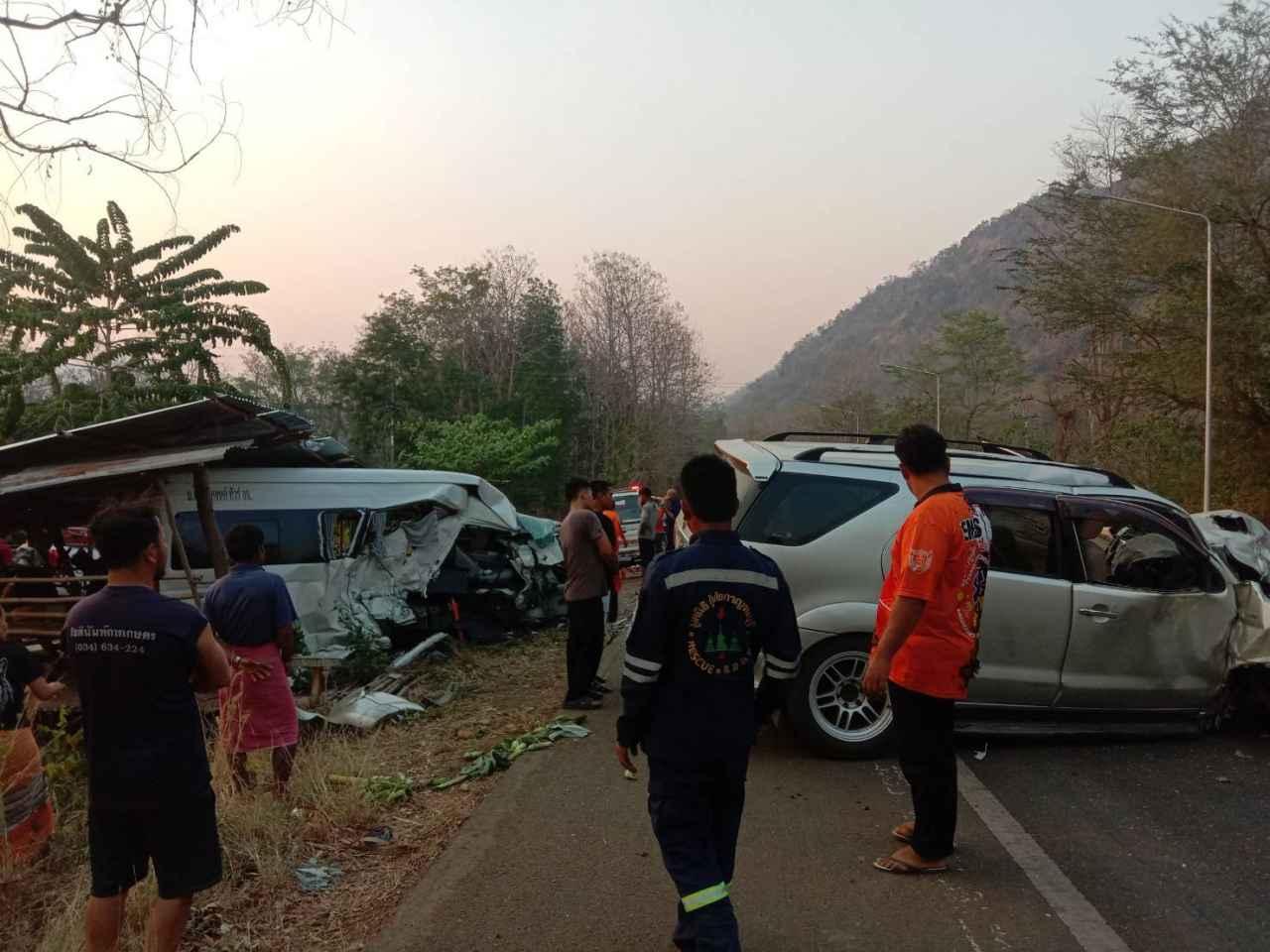 เมื่อเวลา 18.00 น. วานนี้ (26 ก.พ. 2566) ว่าที่ พ.ต.ต.สฤษฏ์ ทีคะสุข สารวัตรสอบสวน สภ.ไทรโยค จ.กาญจนบุรี รับแจ้งมีอุบัติเหตุรถชนกันมีผู้เสียชีวิตและบาดเจ็บหลายราย บนถนนสาย 323 กาญจนบุรี-ไทรโยค ใกล้กับวัดพุตะเคียน หมู่ 4 ต.ท่าเสา อ.ไทรโยค จ.กาญจนบุรี จึงรุดไปตรวจสอบพร้อมด้วย จนท.ตำรวจท่องเที่ยวกาญจนบุรี ส.ทท.1 กก.1 บก.ทท.3 (กาญจนบุรี) จนท.ตม.กาญจนบุรี และ จนท.ท่องเที่ยวและกีฬา จ.กาญจนบุรี และประสานแพทย์เวร รพ.สมเด็จพระปิยมหาราชรมณียเขต มูลนิธิพิทักษ์กาญจน์ จุดไผ่ล้อมพุเตย จุดไทรโยคใหญ่ จุดทุ่งก้างย่าง และมูลนิธิกู้ภัยกาญจนบุรี อำนวยการที่เกิดเหตุใช้อุปกรณ์เครื่องตัดถ่างช่วยเหลือทันที