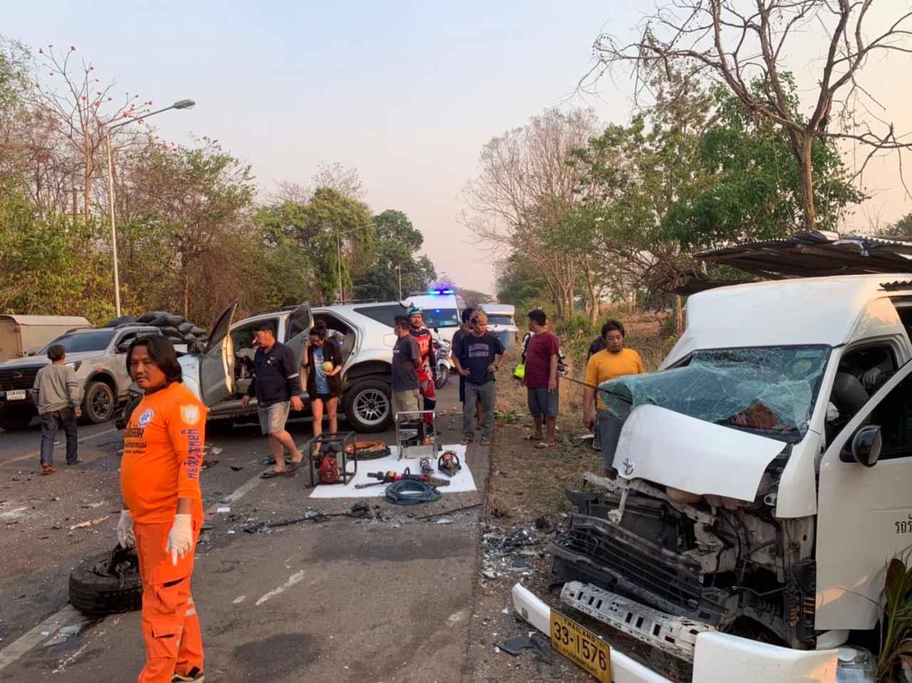 ใกล้กันที่ริมถนนพบรถตู้ยี่ห้อโตโยต้า รุ่นคอมมิวเตอร์ สีขาว หมายเลขทะเบียนป้ายเหลือง 33-1576 กทม. ด้านข้างรถมีสติกเกอร์ บริษัท โก ไทยแลนด์ ทัวร์ จำกัด ชนกับเพิงขายของสินค้าเกษตรของชาวบ้าน สภาพด้านหน้าพังกันชนหน้าหลุด กระจกหน้าแตก ประตูคนขับฉีกขาดยาวไปด้านข้างขวา พบว่าคนขับถูกหลังคารถตู้และด้านหน้ารถตู้กดทับอัดอยู่คาพวงมาลัย ทราบชื่อคือนาย นายประสิทธิ์ บุญเยี่ยม อายุ 55 ปี ชาว ต.แจนแวน อ.ศรีณรงค์ จ.สุรินทร์ สภาพศพสวมเสื้อสีแดง นุ่งกางเกงยีนส์ขายาว แขนขวาหัก คอหัก ในรถตู้โดยสารนำเที่ยวยังพบผู้บาดเจ็บสาหัสหนึ่งรายทราบชื่อ คือ นายโธมัส สตาค ออฟ กอลต์ไซม์ (Mr.THOMAS STACH VON GOLTZHEIM) อายุ 53 ปี ชาวเยอรมัน กระดูกเชิงกรานหัก ขาขวาช่วงหน้าแข้งหัก เสียเลือดมาก นำตัวส่ง รพ.สมเด็จพระปิยมหาราชรมณียเขต แต่ก็เสียชีวิตในเวลาต่อมา ส่วนผู้บาดเจ็บอีก 2 ราย คือ นางสาวอเล็กซานดรา สตาช วอน โกลต์ไฮม์ (Ms.ALEXANDRA STACH VON GOL TZHEIM) อายุ 51 ปี ชาวเยอรมัน ได้รับบาดเจ็บที่ขาขวา ไม่สาหัส และ นายจรินทร์ ธำรงสุพพัตกุล อายุประมาณ 48 ปี เป็นมัคคุเทศก์ ไม่ทราบที่อยู่ มีใบอนุญาตเลขที่ 11-28882 ได้รับบาดเจ็บเล็กน้อย