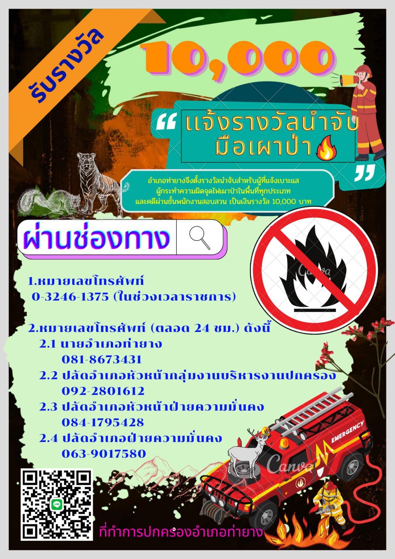 อำเภอท่ายางจึงตั้งรางวัลนำจับสำหรับบุคคลทั่วไปที่แจ้งเบาะแสผู้กระทำผิดจุดไฟเผาป่าในพื้นที่ทุกประเภทในท้องที่อำเภอท่ายาง และคดีผ่านชั้นพนักงานสอบสวน เป็นเงินรางวัล จำนวน 10,000 บาท โดยแจ้งเบาะแส ผ่านช่องทางดังนี้