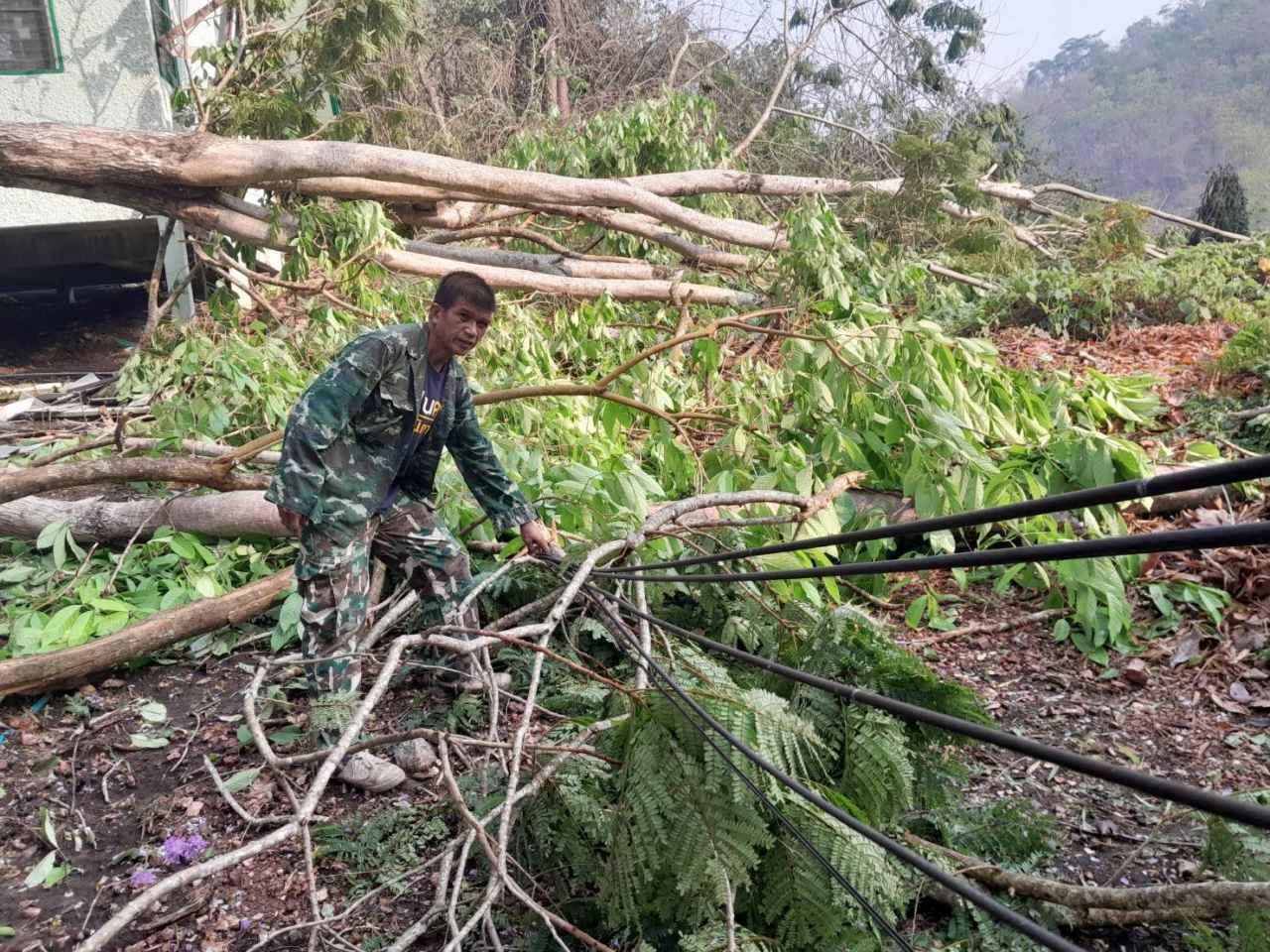 อุทยานแห่งชาติเอราวัณ ต.ท่ากระดาน อ.ศรีสวัสดิ์ นายประวัฒน์ พวงทอง หัวหน้าอุทยานแห่งชาติเอราวัณ ได้นำเจ้าหน้าที่อุทยานเจ้าทำการตัดต้นไม้ใหญ่ที่ถูกลมพัดแรงจนล้มทับอาคารที่พัก ร้านกาแฟ บ้านพักเจ้าหน้าที่อุทยาน และอาคารให้บริการนักท่องเที่ยวที่ศูนย์บริการนักท่องเที่ยวในอุทยานได้รับความเสียหายหลายจุด