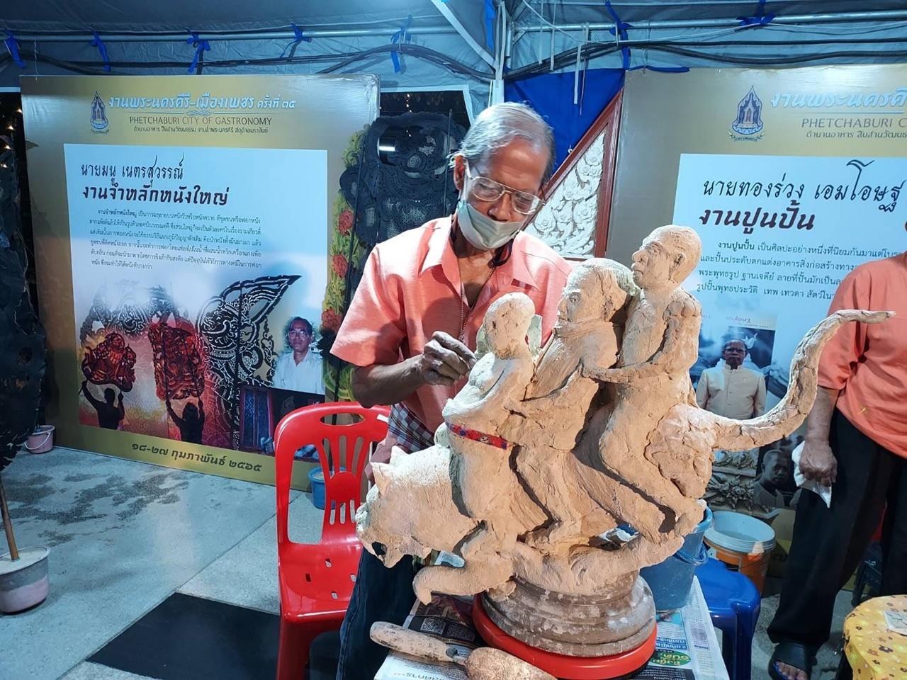 นายทองร่วง เอมโอษฐ ศิลปินแห่งชาติ สาขาทัศนศิลป์ (ประณีตศิลป์-ศิลปะปูนปั้น) เป็นศิลปินปูนปั้นและผู้เชี่ยวชาญด้านศิลปะปูนปั้น มีฝีมือยอดเยี่ยมและจินตนาการอันบรรเจิดที่มีรูปแบบในการปั้นและสูตรเฉพาะตัวในการตําปูน ที่สืบทอดและอนุรักษ์ศิลปะปูนปั้นดั้งเดิม ของช่างเมืองเพชร มีผลงานปูนปั้นที่ซุ้มประตู ซุ้มหน้าต่าง ศาลาการเปรียญ และพระอุโบสถตามวัดในจังหวัดเพชรบุรีและต่างจังหวัดมากมาย เช่น วัดมหาธาตุวรวิหาร วัดพลับพลาชัย วัดโคก และวัดเขาบันไดอิฐ ทั้งนี้ได้สร้างสรรค์ผลงานอย่างต่อเนื่องทั้งในประเทศและต่างประเทศ ผลงานมีทั้งประเภทความงามด้านประเพณีช่างโบราณ เช่น ช่อฟ้า ใบระกา ซุ้มประตู ซุ้มหน้าต่าง หน้าบัน คันทวย อย่างสวยงาม และประเภทแนวสร้างสรรค์สังคม โดยการปั้นรูปล้อเลียนบุคคลทางการเมืองในแต่ละยุคสมัยนอกจากนี้ผลงานปั้นยังสอดแทรกคติธรรม ข้อคิดต่างๆ เป็นการผ่อนคลายความเครียด และสะท้อนภาพสังคมในยุคนั้นๆ และยังก่อให้เกิดอรรถรสในการชมงานศิลปะปูนปั้น ทําให้ดูมีชีวิตชีวา ให้ความรู้สึกถึงความจริงแห่งวิถีในสังคมไทย ซึ่งเป็นการสร้างสรรค์ผลงานที่มีคุณค่าเพื่อให้ได้ศึกษาค้นคว้าเรื่องราวทางประวัติศาสตร์ และสังคมวัฒนธรรมไทย