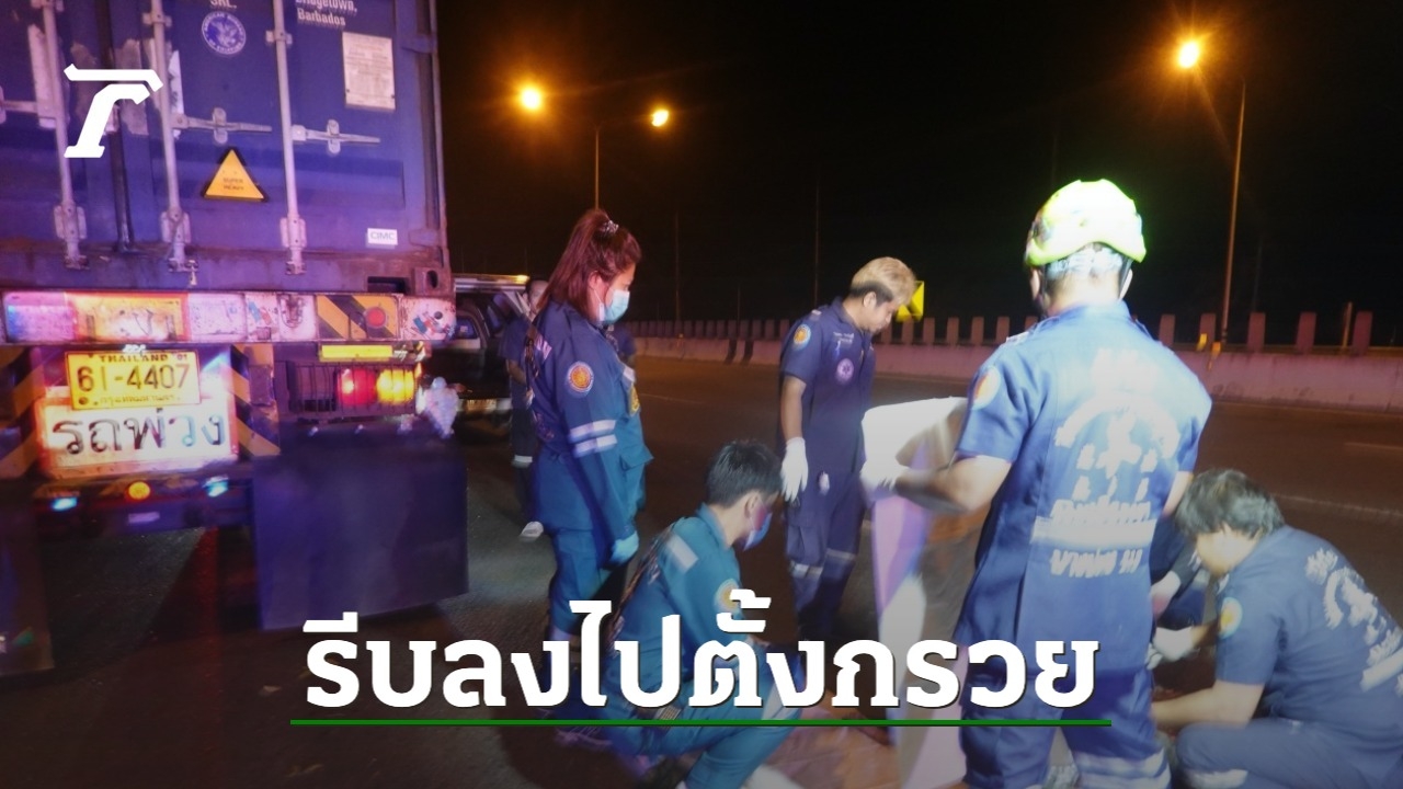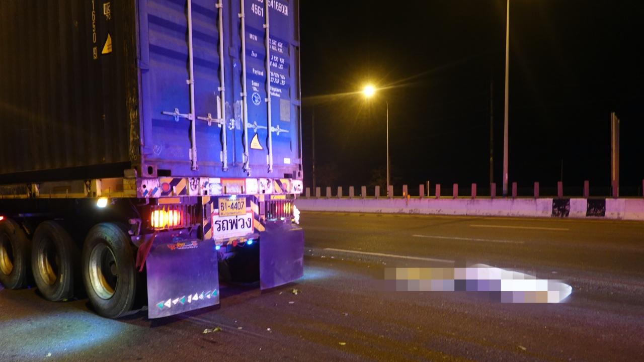 โชเฟอร์รถพ่วง 22 ล้อลงไปตั้งกรวยเพราะรถเสียแล้วกีดขวางเลนซ้าย กลัวมีคนมาชน ระหว่างตั้งกรวยถูกรถพ่วง 18 ล้อ ที่ขับเข้าโค้งมามองไม่เห็นชนแล้วทับร่างเสียชีวิตบนมอเตอร์เวย์