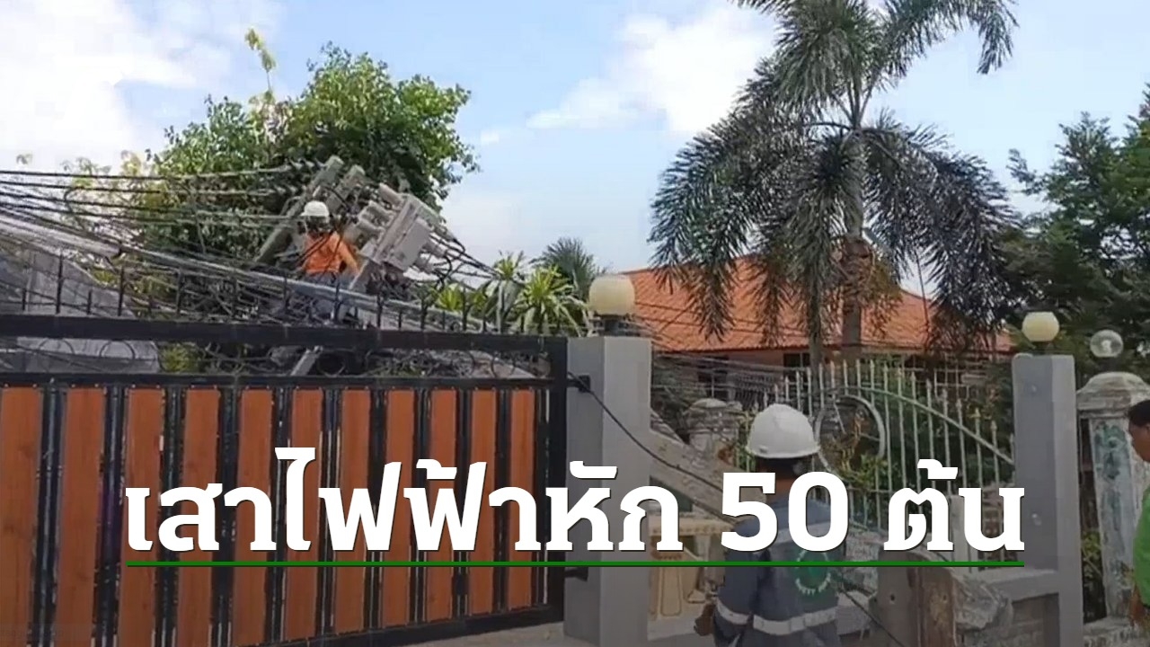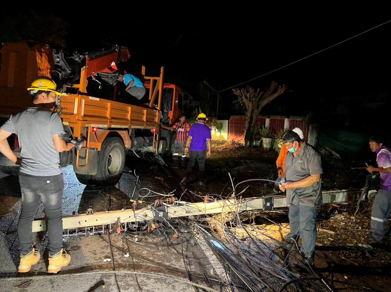 ขณะเดียวกัน ยังมีเสาไฟฟ้าริมถนนคันคลอง ช่วงระหว่างเส้นทางบ้านโคกกะเทียม-บ้านหมี่ เสาไฟฟ้าแรงสูงถูกพายุพัดหักโค่นจำนวน 52 ต้น เสาไฟได้ล้มทับบ้าน ปั๊มน้ำมัน สายไฟ เสาไฟล้มพาดถนนขวางทางเข้าบ้านโคกกะเทียม ทำให้ไฟฟ้าดับหลายหมู่บ้าน การไฟฟ้าส่วนภูมิภาคลพบุรี จึงนำกำลังเจ้าหน้าที่แก้ไขซ่อมแซม เพื่อจ่ายกระแสไฟให้กับประชาชนใช้ได้ก่อนเป็นการชั่วคราว และซ่อมแซมไปในคราวเดียวกันตลอดทั้งคืน ซึ่งยังไม่แล้วเสร็จ คาดต้องใช้เวลาอีกกว่า 24 ชั่วโมง