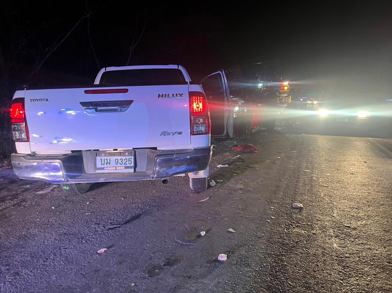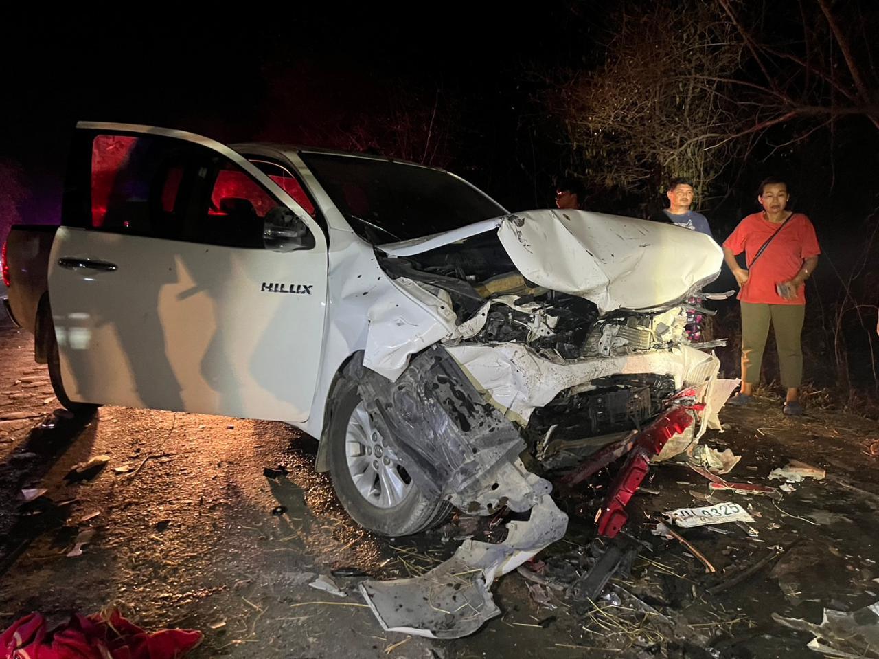 ในที่เกิดเหตุเป็นถนนสองเลนแบบสวนกัน พบรถกระบะยี่ห้อโตโยต้า รุ่นรีโว่แคป สีขาว ทะเบียน บม 9325 สระแก้ว สภาพด้านหน้าพังยับห้องเครื่องยุบเข้ามาหนักไปแถบคนขับ ทราบชื่อคนขับคือ นายวรวิทย์ พุทธพงษ์ อายุ 36 ปี ชาวบ้าน หมู่ 5 ต.อ่าวลึก อ.เมือง จ.ประจวบคีรีขันธ์ มาคนเดียวได้รับบาดเจ็บที่หน้าอกและศีรษะเกิดจากแรงอัดกระแทก ส่วนรถกระบะยี่ห้ออีซูซุ รุ่นดีแมคซ์ สีแดง ทะเบียน บม 1631 กาญจนบุรี จอดหันหน้าใส่กัน สภาพด้านหน้าห้องเครื่องพังยับ กระบะท้ายยก ใส่คอกเหล็กสำหรับบรรทุกวัวหักงอ ทราบชื่อคนขับคือ นายวสันต์ วงษ์นำ อายุ 35 ปี ชาวบ้าน ต.สระสี่มุม อ.กำแพงแสน จ.นครปฐม ได้รับบาดเจ็บที่ใบหน้าและหน้าอกจากแรงอัดกระแทก มีผู้บาดเจ็บที่มากับรถคอกอีก 8 ราย มีทั้งผู้ใหญ่และเด็ก ถูกลำเลียงส่งตัวรักษาทันที ยังพบซากวัวลานนอนตายริมถนน 1 ตัว และวัวลานที่บาดเจ็บอีก 3 ตัว จึงนำกลับไปคอกวัวที่บ้านดอนตาเพชร