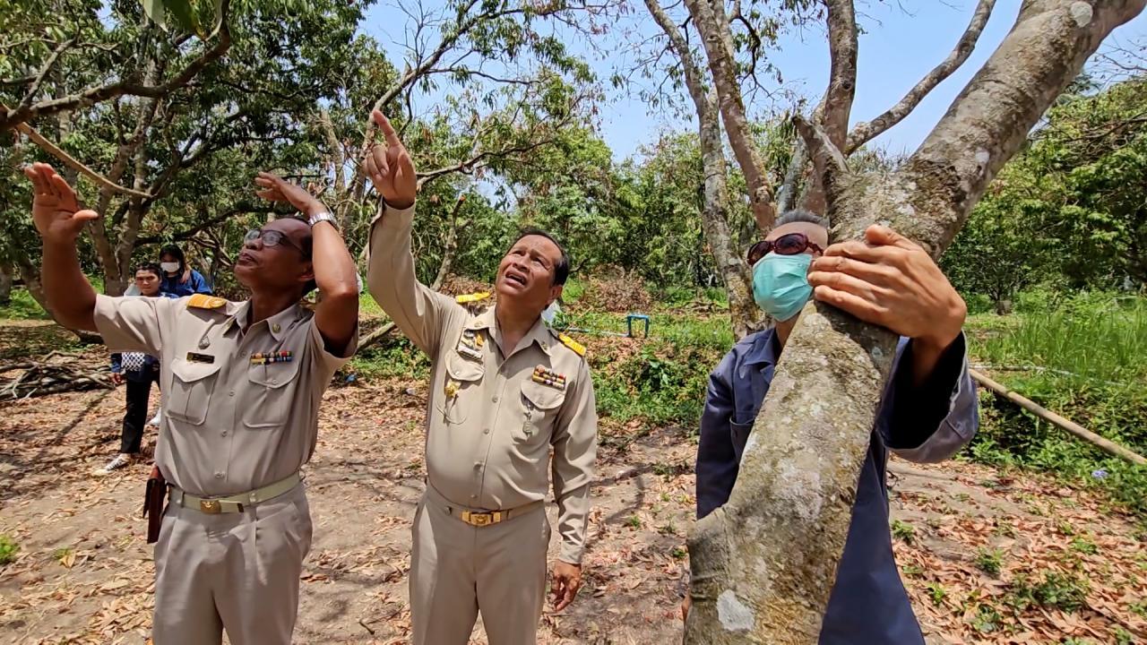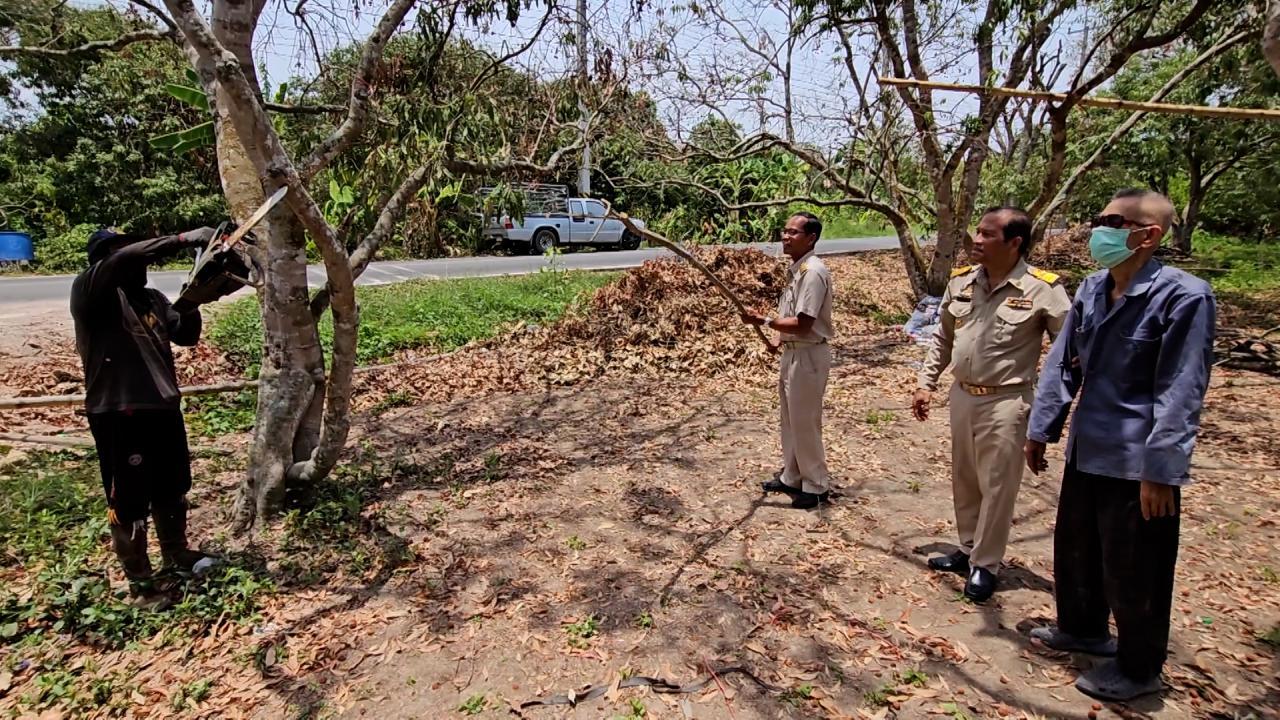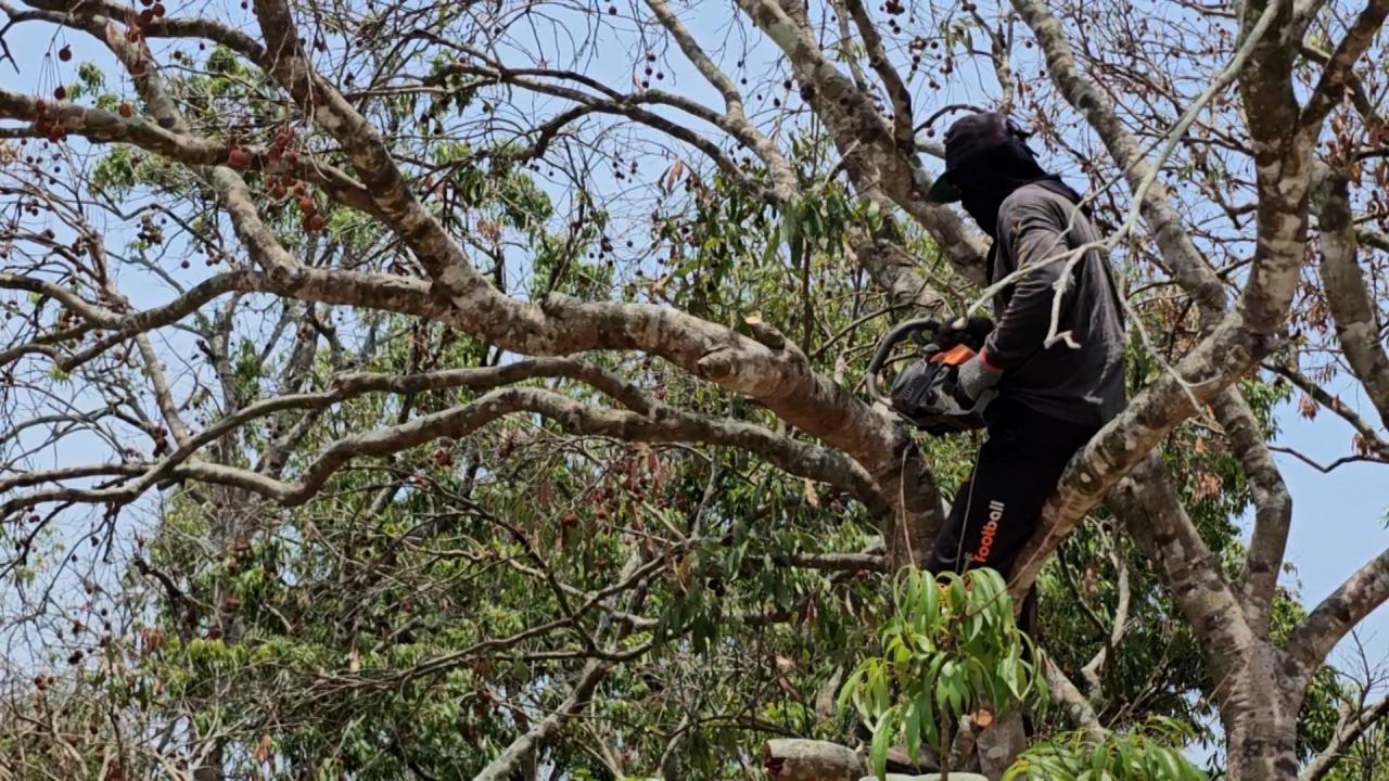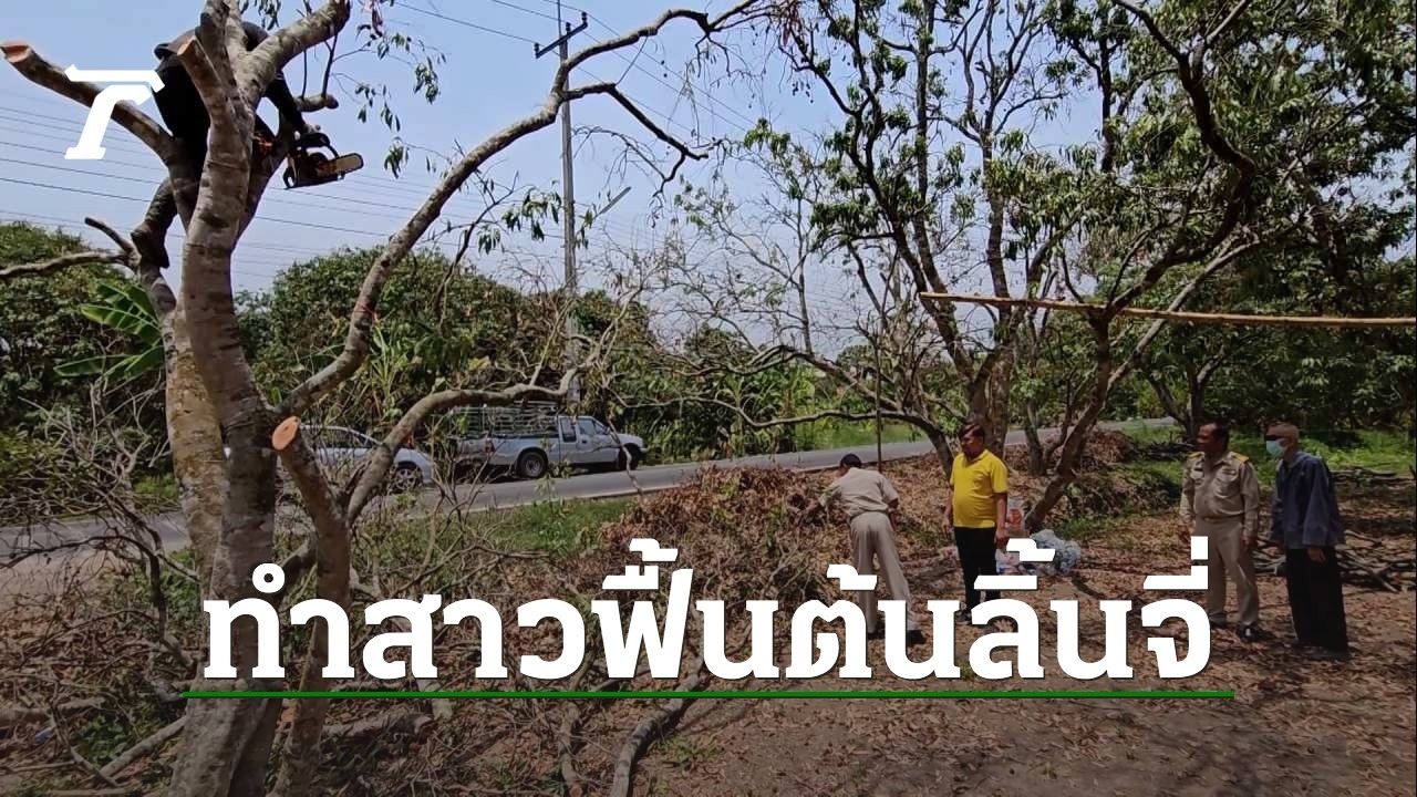 ชาวสวนที่สมุทรสงคราม เร่งตัดแต่งกิ่งก้านใบ หรือ ทำสาวให้ต้นลิ้นจี่ หลังก่อนหน้าออกลูกดกแล้วมาเจออากาศร้อนจัดนานนับเดือน เริ่มยืนต้นตายเสียหายไปครึ่งสวน เพื่อให้ลิ้นจี่แตกใบใหม่เหมือนต้นสาวๆ