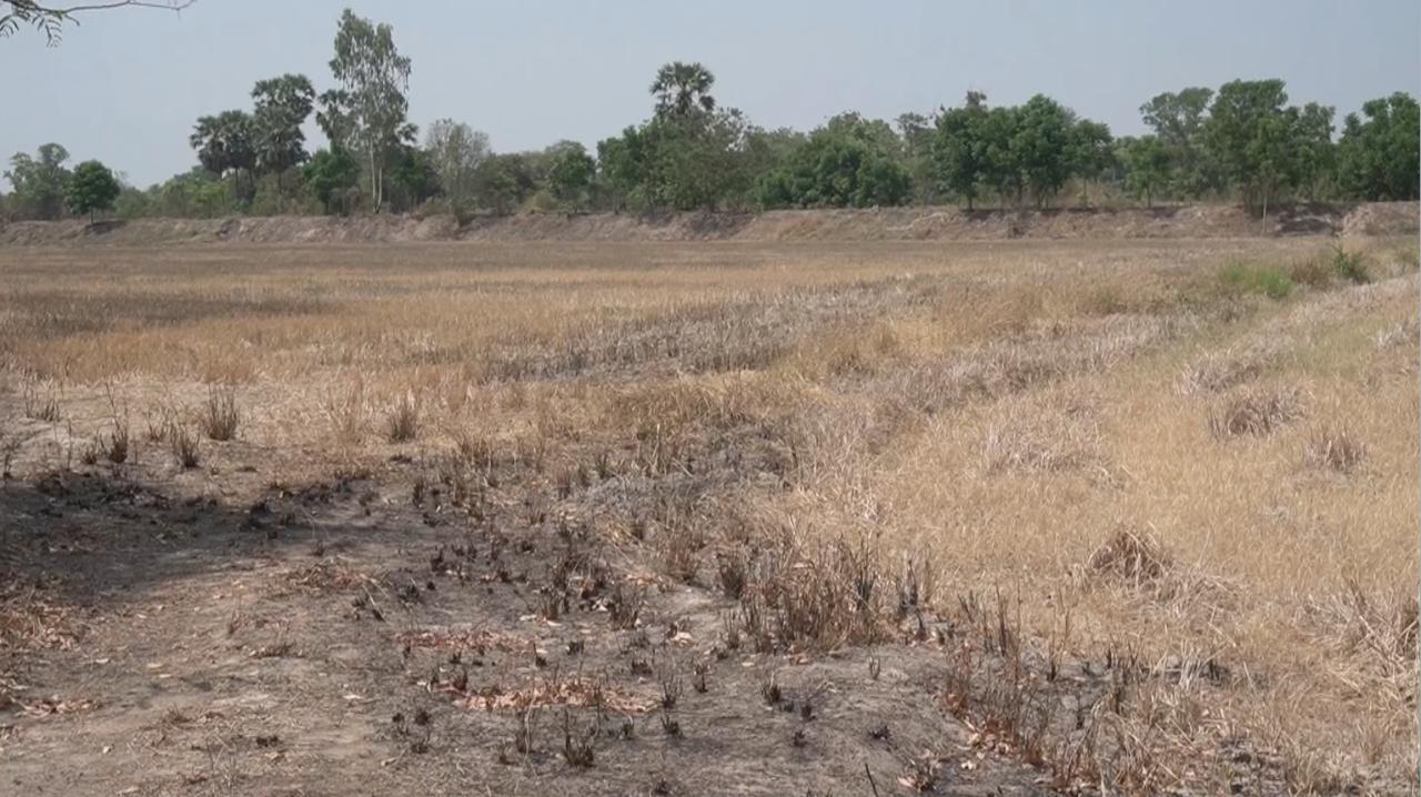 ขณะผืนนาที่อยู่ใกล้เคียงนาของนางจำรูญนั้นยังมีรอยเผาซัง หรือตอข้าวให้เห็นเป็นรอยไหม้ แถมยังมีร่องรอยแห่งความแห้งแล้ง และไม่ได้ทำนามาแล้วเนื่องจากไม่มีน้ำจะทำนานั่นเอง โดยในเรื่องแหล่งน้ำทำนา นางจำรูญ กล่าวว่า นาของตัวเองนั้นก็ต้องใช้น้ำทำนาเหมือนนาข้าวปกติทั่วไป แต่ด้วยนาที่มีซังหรือตอข้าวอยู่ปนกับดินนั้นมันจะช่วยอุ้มน้ำไว้ชุ่มชื้นตลอดเวลา และทำให้ลดต้นทุนในการสูบน้ำเข้านาข้าวได้เยอะในช่วงแล้งแบบนี้