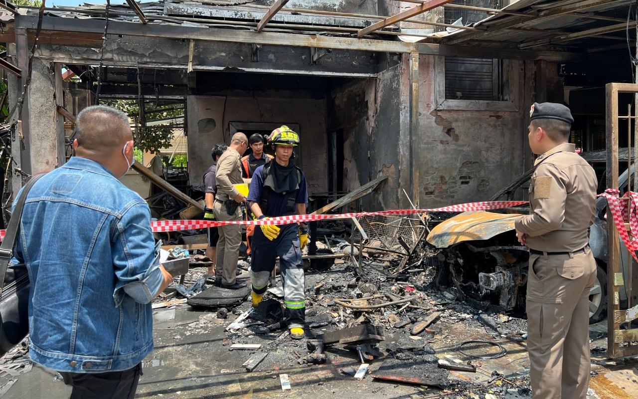 ที่เกิดเหตุเป็นบ้านเดี่ยว 2 ชั้น ปลูกบนเนื้อที่ 53 ตารางวา ตัวบ้านถูกไฟไหม้เกือบทั้งหลัง และโรงจอดรถพบรถยนต์นิสสัน ทีด้า สีบรอนซ์ ทะเบียน 9 กช 3527 กรุงเทพมหานคร ถูกไฟไหม้เสียหายทั้งคัน ส่วนข้างบ้านพบศพนายประสม โพธิ์หล้า อายุ 49 ปี คนงานผสมสารเคมี ถูกแรงระเบิดเสียชีวิตคากองเพลิง ยังมีบ้านใกล้เคียงและฝั่งตรงข้ามบ้านที่เกิดเหตุถูกแรงระเบิดและเศษเหล็กปลิวใส่ได้รับความเสียหาย กระจกประตูหน้าต่างแตกและฝ้าเพดานพัง