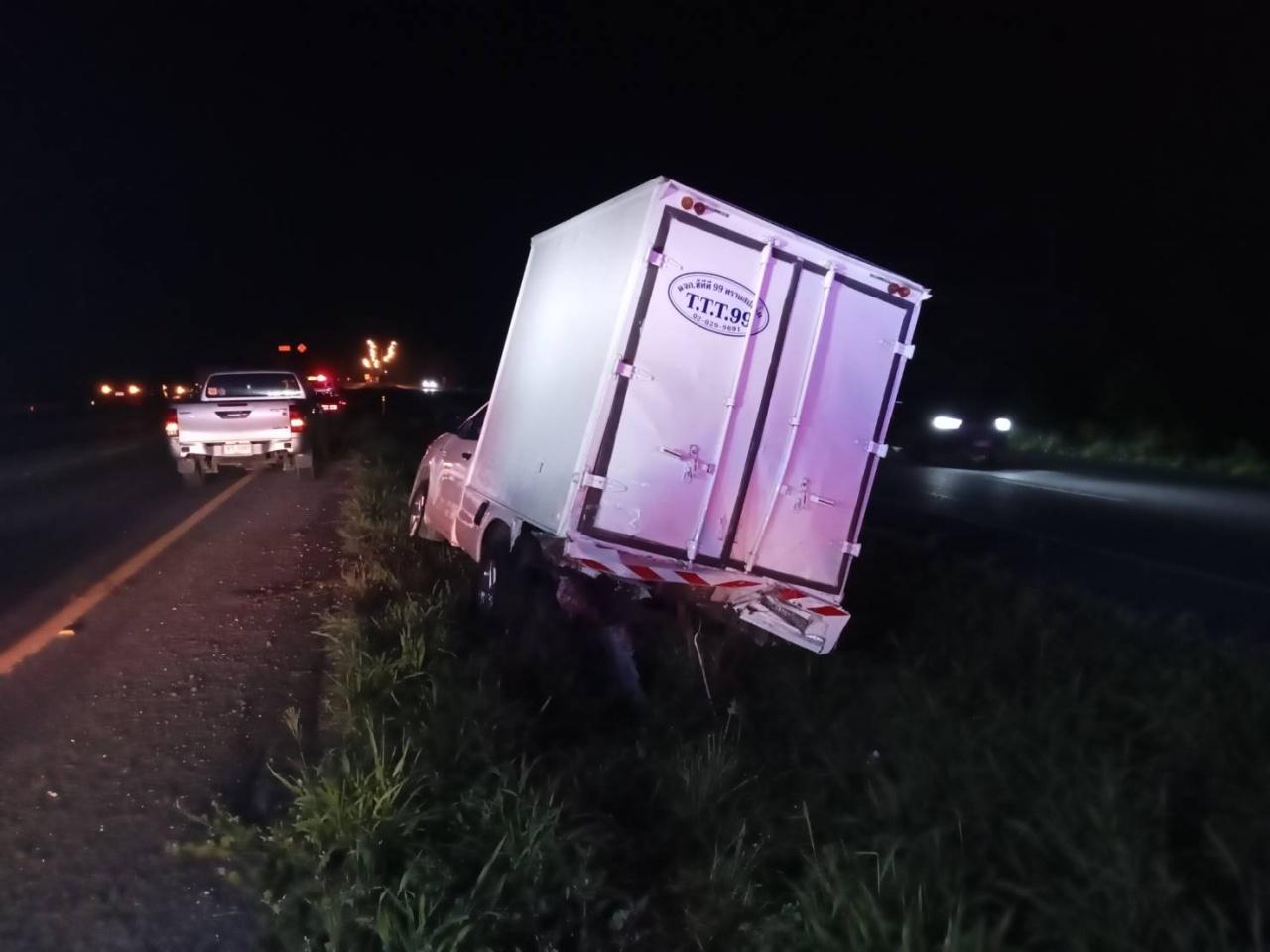 ใกล้กันยังพบรถยนต์กระบะยี่ห้อโตโยต้า สีขาว หมายเลขทะเบียน 1ฒฬ-490 กรุงเทพมหานคร ตกข้างทาง สภาพท้ายรถถูกชนพังยับ