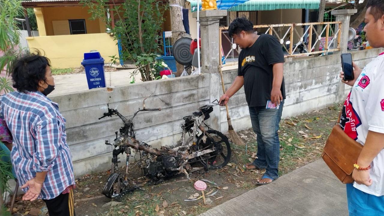 เวลา 10.00 น. วันที่ 27 พ.ค. 66 ร.ต.อ.ณัฐพันธ์ ดำเนินวรกุล รองสารวัตรสอบสวนสวน สภ.สามพราน จ.นครปฐม ได้รับแจ้งจากชาวบ้านว่าพบรถ จยย. ถูกเผาวอดทั้งคันจนเหลือแต่ซาก โดยรถถูกจอดทิ้งไว้ที่บริเวณ หมู่ 2 ต.ท่าตลาด อ.สามพราน จ.นครปฐม ที่เกิดเหตุเป็นลานดินถมใหม่ พบรถ จยย.ถูกไฟเผาไหม้ดำ จนเหลือแต่ซาก