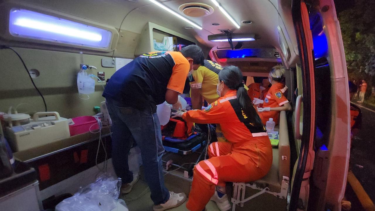 ที่ถนนสาย 3228 เขาปูน-หนองหญ้า ต.หนองหญ้า อ.เมือง จ.กาญจนบุรี แบบสองเลนสวนกัน เป็นถนนลาดยางที่เพิ่งทำเสร็จใหม่ มีไฟส่องสว่าง พบรถ จยย.ฮอนด้าเวฟ สีดำแดง ทะเบียน 1กน 8158 กาญจนบุรี ล้มขวางอยู่ในเลนสวนด้านขวา สภาพแม็กล้อหน้าแตก ช่วงหน้ารถพับงอมาถึงเบาะ ใกล้กันพบผู้เสียชีวิต ทราบชื่อคือ น.ส.กมลวรรณ ทองเปราะ อายุ 18 ปี ที่อยู่ 77 หมู่ 1 ต.บ้องตี้ อ.ไทรโยค จ.กาญจนบุรี นอนคว่ำหน้า แขนขวาหักหลายท่อน ขาขวาหัก ศีรษะเปิด ไม่มีอวัยะสมอง ส่วนอีกรายทำการปั๊มหัวใจ CPR บนรถมูลนิธิฯ กว่า 20 นาที ไม่เป็นผล เสียชีวิตในเวลาต่อมา ทราบชื่อ น.ส.วาสนา ไม่มีนามสกุล อายุ 17 ปี เป็นคนพื้นที่สูง ต.บ้องตี้ อ.ไทรโยค จ.กาญจนบุรี สภาพศพฟกช้ำตามร่างกาย ส่วนผู้บาดเจ็บสาหัสถูกนำตัวส่ง รพ.พหลพลพยุหเสนา ทราบชื่อ น.ส.รัตน์ อายุ 16 ปี เป็นคนพื้นที่สูง ต.บ้องตี้ อ.ไทรโยค จ.กาญจนบุรี และเสียชีวิตในเวลาต่อมา รวมเสียชีวิต 3 ศพ โดยทั้งหมดเป็นนักศึกษาวิทยาลัยเกษตรและเทคโนโลยีกาญจนบุรี