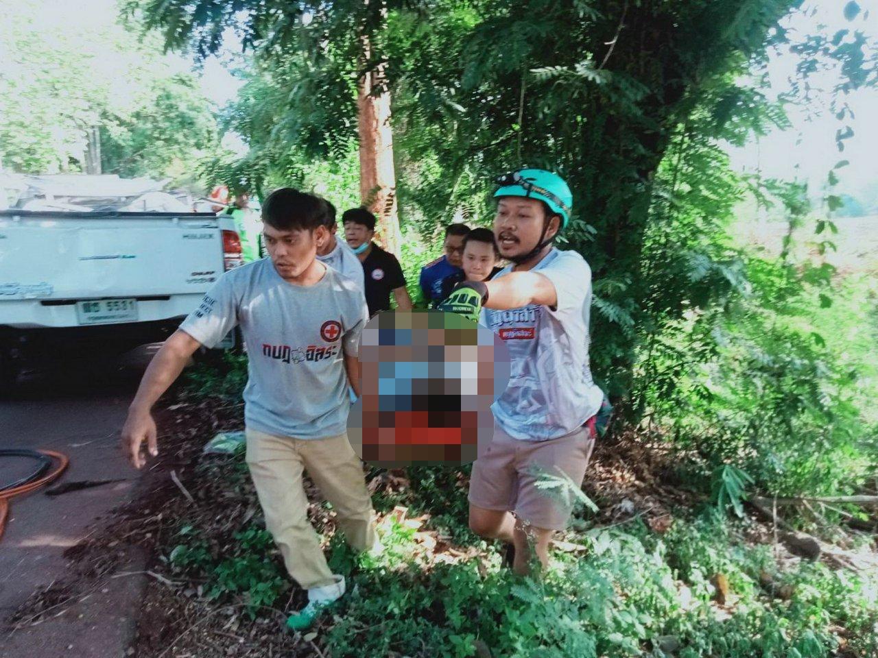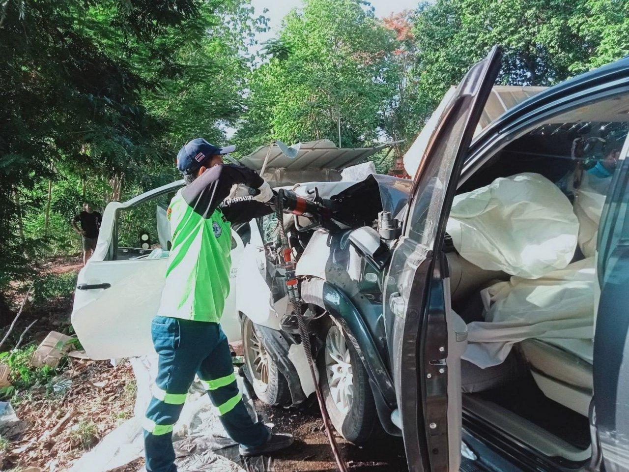 ส่วนรถยนต์ที่นั่งส่วนบุคคลยี่ห้อปาเจโร่ พบผู้เสียชีวิต 2 ราย ทราบชื่อคือนายมาโนช ปิ๋วท่าไม้ อายุ 64 ปี ชาวบ้านหมู่ 7 ต.ทุ่งน้อย อ.เมือง จ.นครปฐม เสียชีวิตอยู่หน้าพวงมาลัย และ นางศิริวรรณ ปิ๋วท่าไม้ อายุ 62 ปี ชาวบ้าน หมู่ 4 ต.สามพราน อ.สามพราน จ.นครปฐม เสียชีวิตอยู่ที่เบาะซ้าย โดยทั้ง 2 เป็นสามีภรรยากัน โดยเจ้าหน้าที่ใช้เวลาไม่นานนักก็สามารถนำร่างผู้เสียชีวิตทั้ง 3 ราย ออกมาจากตัวรถได้ หลังจากคณะแพทย์ทำการชันสูตรเบื้องต้นแล้วเสร็จ จึงนำศพไปไว้ที่ รพ.ไทรโยค พร้อมประสานให้ญาติของผู้เสียชีวิตทั้ง 2 ฝ่ายให้ทราบ เมื่อญาติของทั้ง 2 ฝ่ายมาถึงโรงพยาบาลต่างก็มีอาการเศร้าโศกเสียใจเป็นอย่างมาก